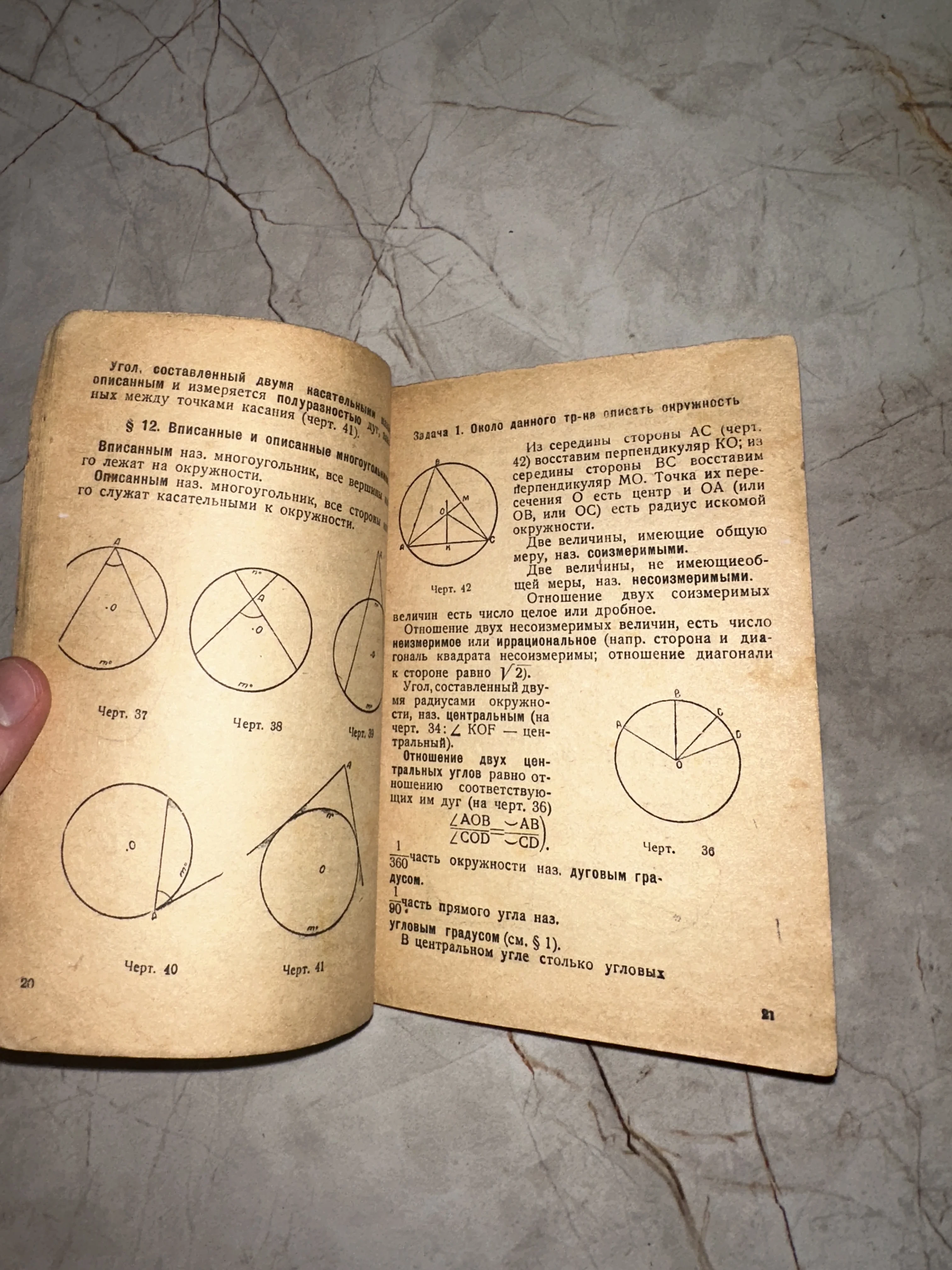 Раритетный учебник по планиметрии, сохранивший четкость типографской печати и строгость классических геометрических чертежей. Пожелтевшие от времени страницы передают атмосферу советской или дореволюционной школы, делая этот экземпляр ценным артефактом для коллекционеров научной литературы.