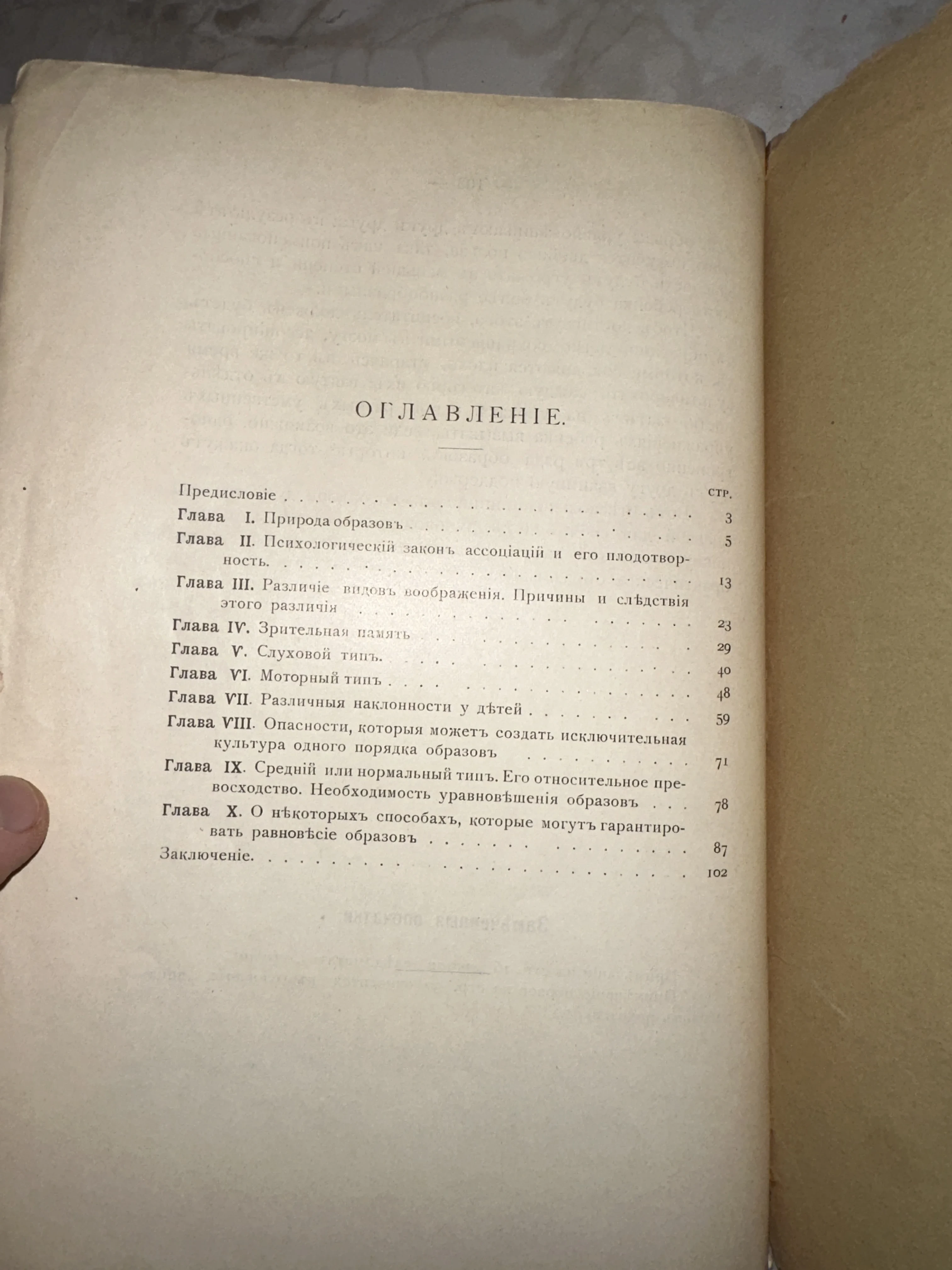 Перед вами оглавление редкого труда по психологии и педагогике, посвященного природе образов и тайнам человеческой памяти. Текст набран изящным шрифтом с использованием дореволюционной орфографии, что придает изданию особый исторический шарм. Благородная патина времени на бумаге подчеркивает почтенный возраст и коллекционную ценность этой книги.