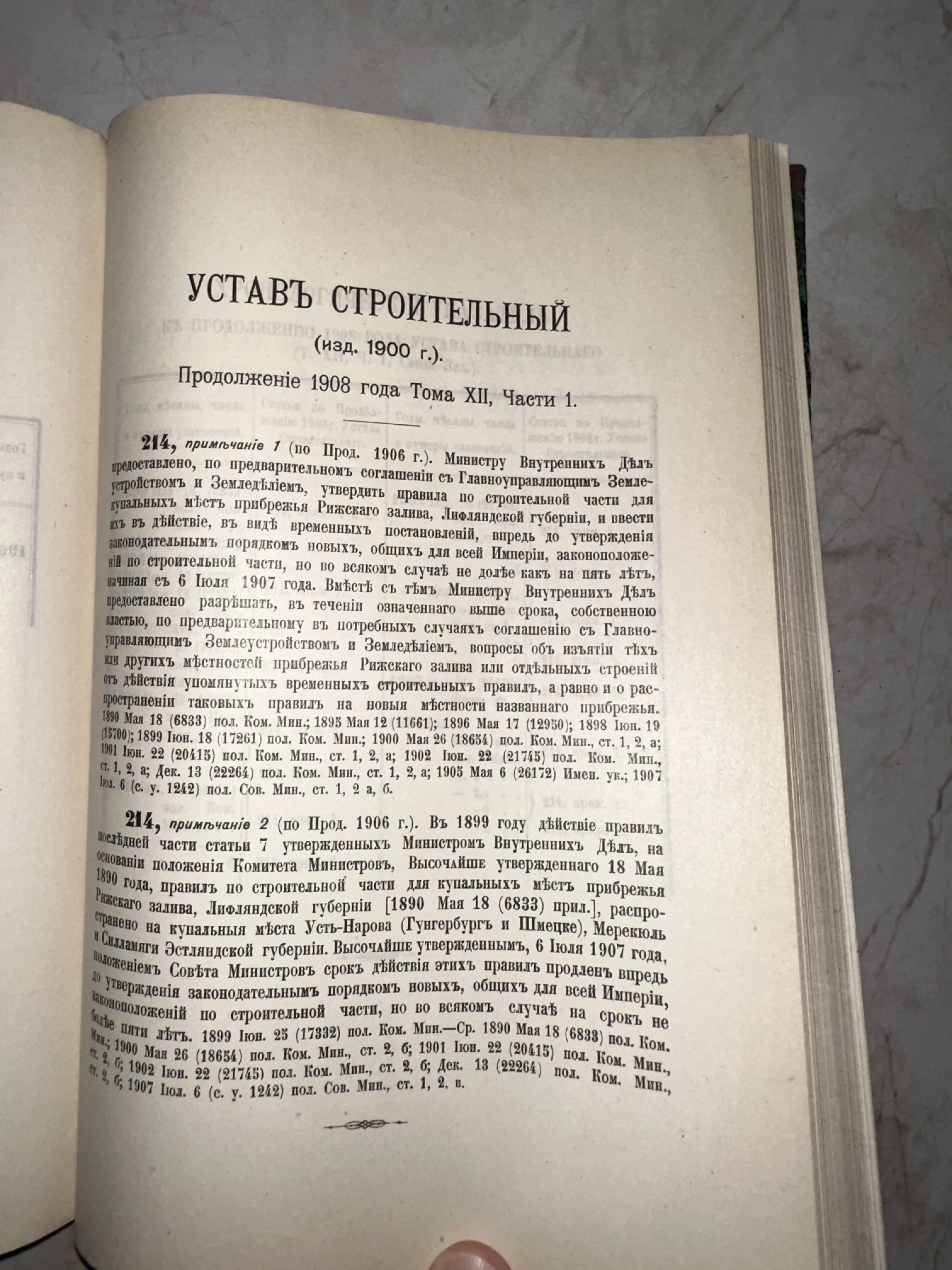 Подлинная страница из свода законов Российской Империи, регламентирующая строительное дело и правила благоустройства прибрежных зон в начале XX века. Текст выполнен четким типографским шрифтом на плотной бумаге с характерной патиной времени, сохранив дух официальной документации эпохи Николая II. Настоящая находка для коллекционеров юридической литературы и исследователей истории архитектуры.