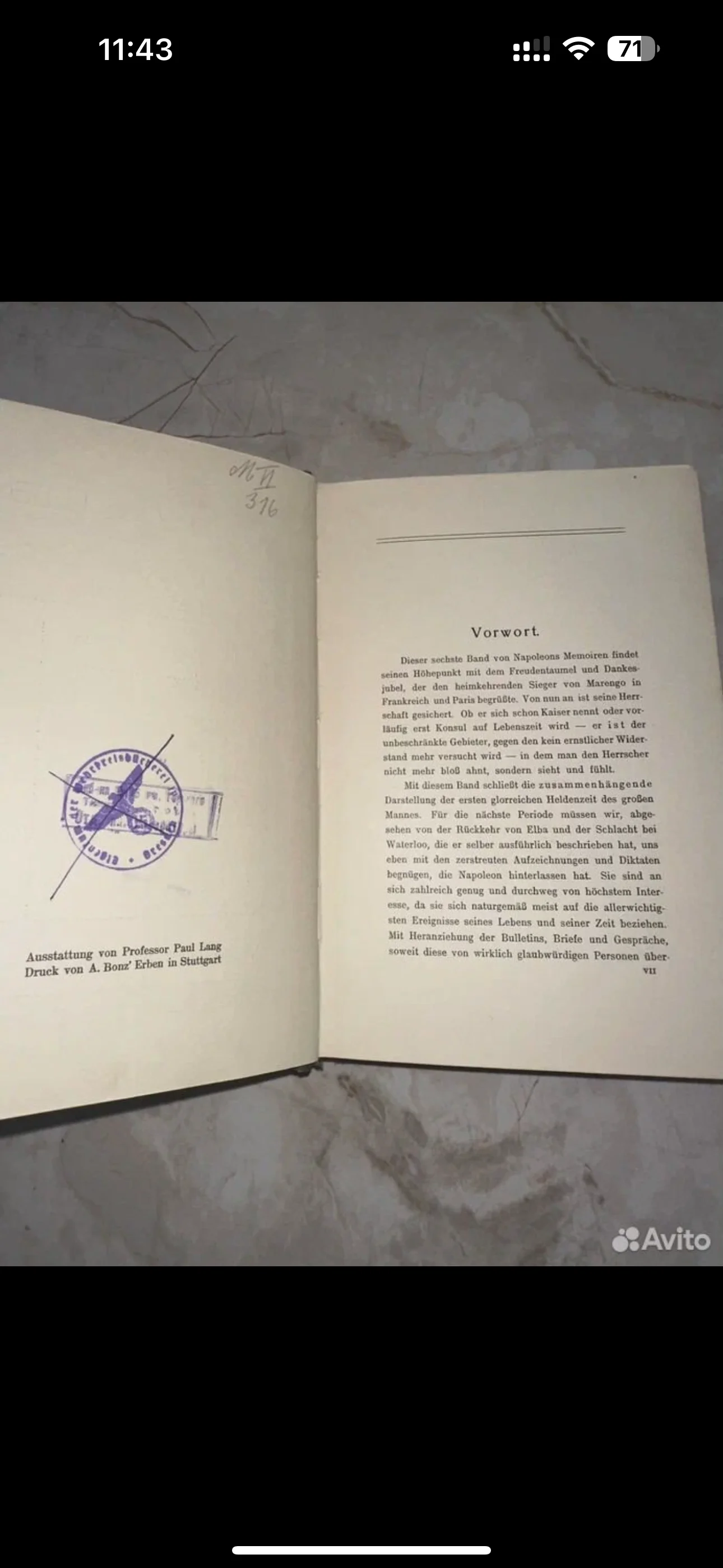 Перед вами страница из шестого тома мемуаров Наполеона Бонапарта, изданного в Штутгарте типографией A. Bonz' Erben. Издание отличается благородной патиной времени, сохранившимся библиотечным штампом и аутентичной типографикой начала XX века, что придает предмету особую коллекционную ценность. Текст предисловия погружает в атмосферу великих походов и исторических потрясений прошлого.