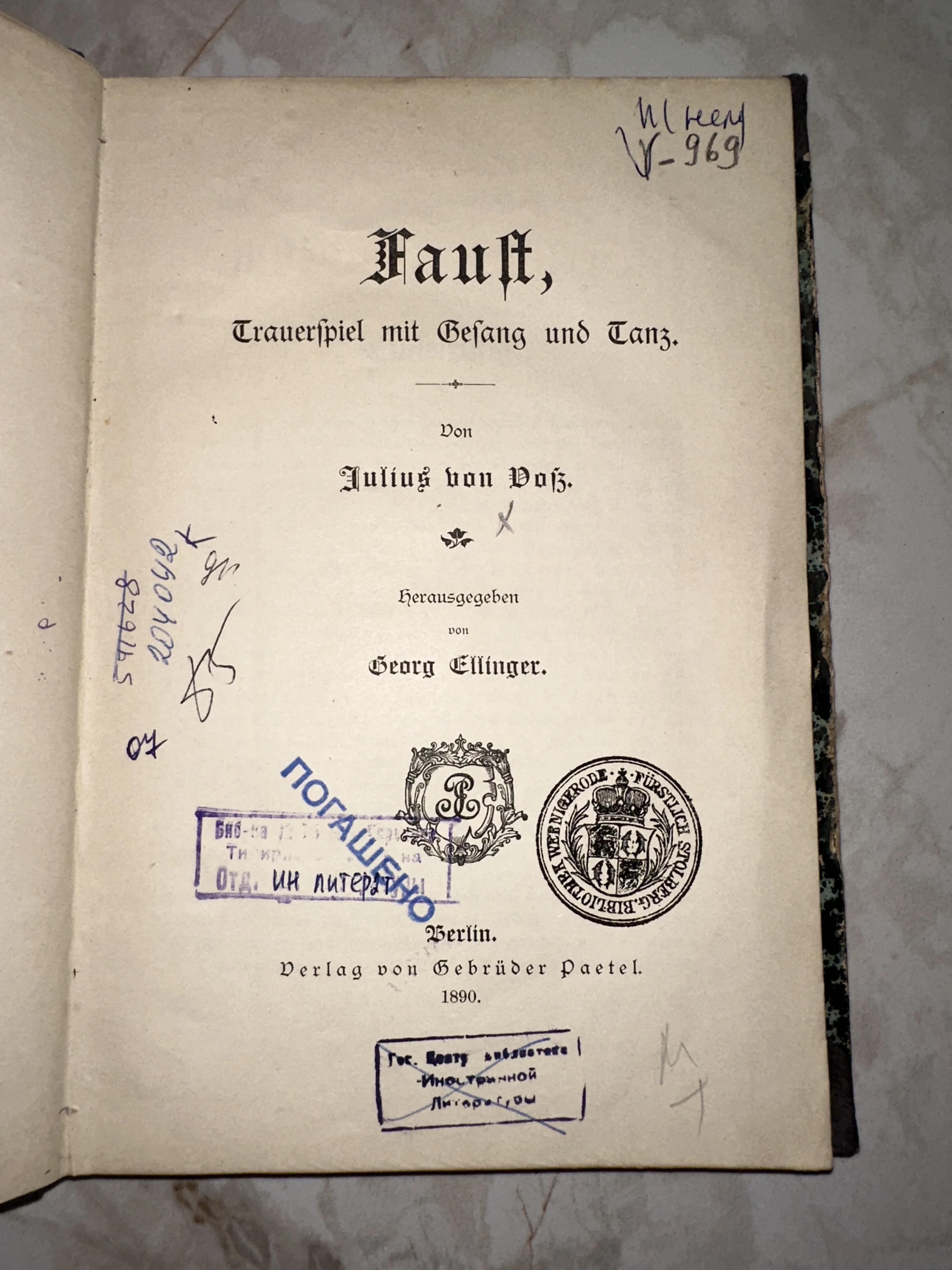 Редкое берлинское издание 1890 года представляет собой трагедию «Фауст» в интерпретации Юлиуса фон Фосса, напечатанную классическим готическим шрифтом. Особую коллекционную ценность экземпляру придает богатый провенанс: на странице отчетливо видны штампы библиотеки князей Стольберг-Вернигероде и последующие архивные пометки. Благородная патина времени и уникальные экслибрисы делают эту книгу настоящей находкой для ценителей европейской истории и литературы.