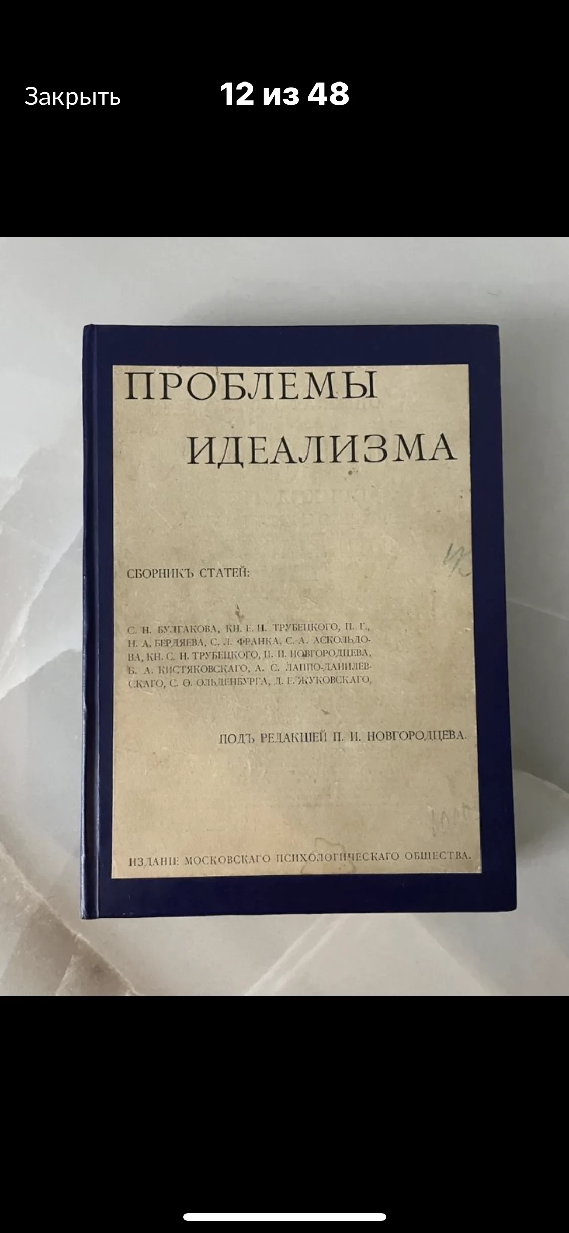 Старинная книга с названием Проблемы идеализма под редакцией Новгородцева на темно-синем фоне.