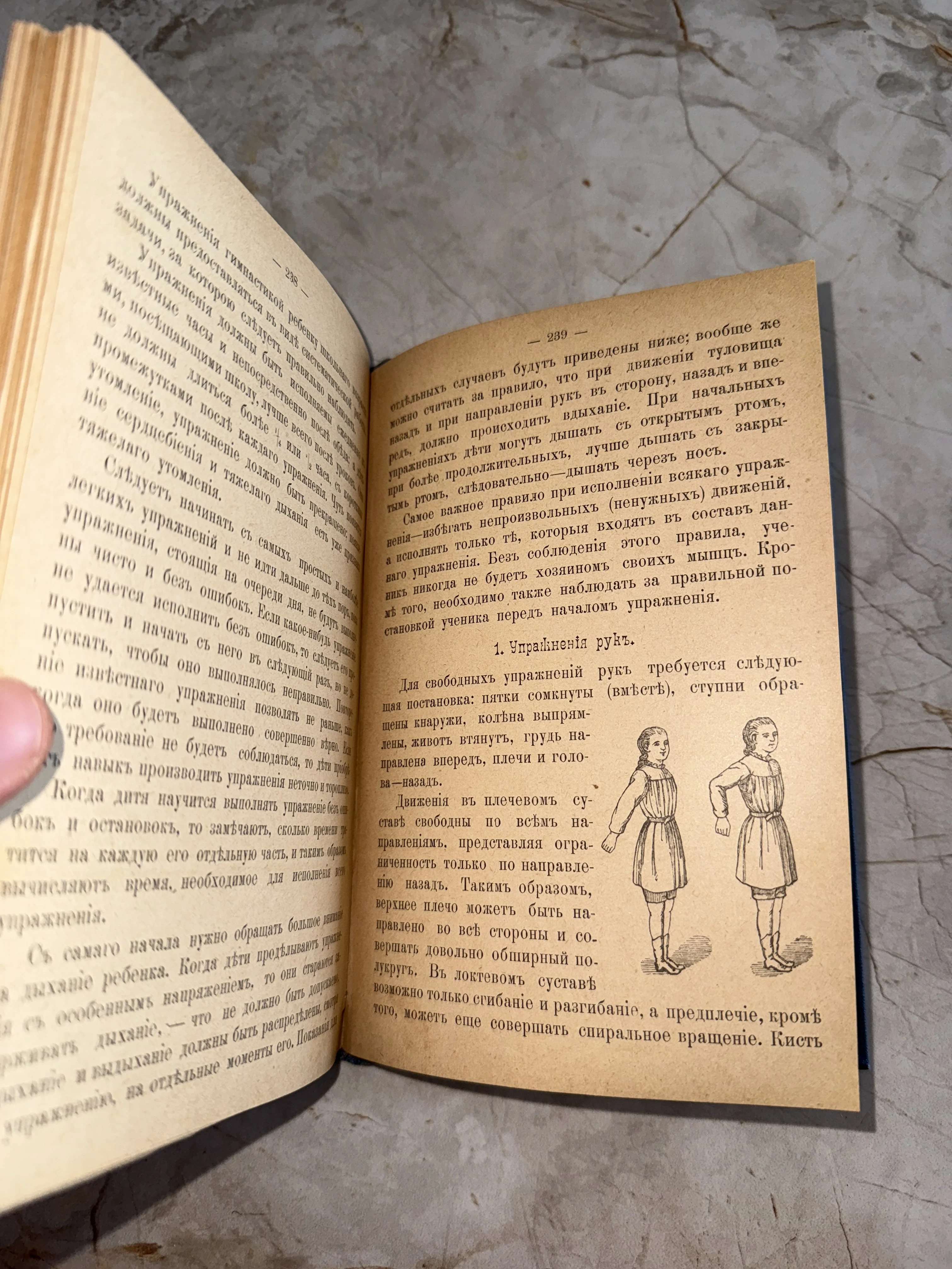 Уникальный экземпляр методического пособия начала прошлого столетия, посвященный физическому развитию детей. Страницы из плотной бумаги сохранили четкий дореволюционный шрифт и очаровательные иллюстрации, демонстрирующие технику упражнений. Книга передает строгую атмосферу образовательной системы прошлого и является редким артефактом для коллекционеров педагогической литературы.