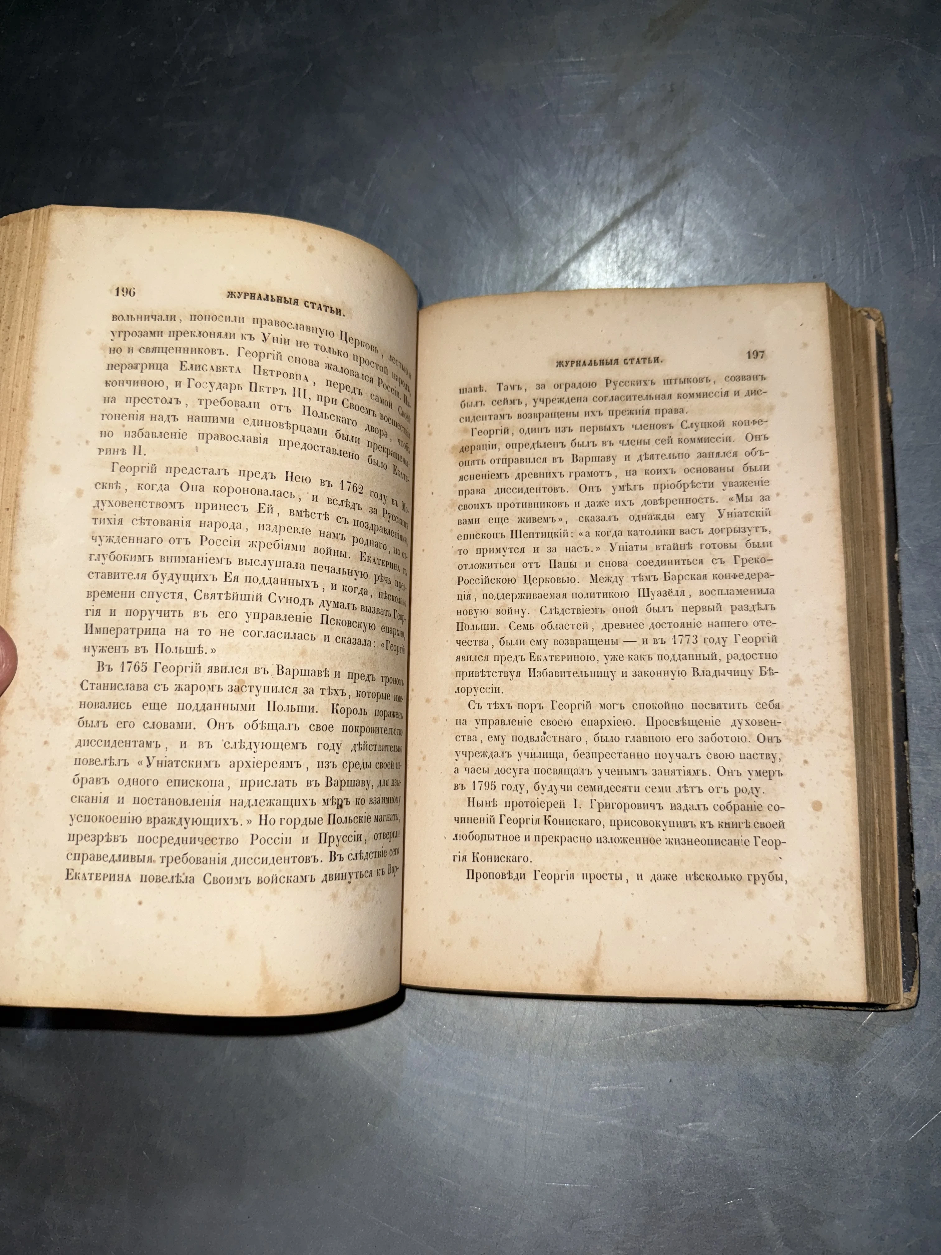 Перед вами подлинный фрагмент истории — разворот антикварной книги с «Журнальными статьями», напечатанными в дореволюционной орфографии. Пожелтевшие от времени страницы с характерными пятнами лисьего грибка (фоксингами) и упоминание эпохи Екатерины II создают неповторимую атмосферу старины. Это издание станет жемчужиной в коллекции библиофила или ценным источником для исследователя русской истории.