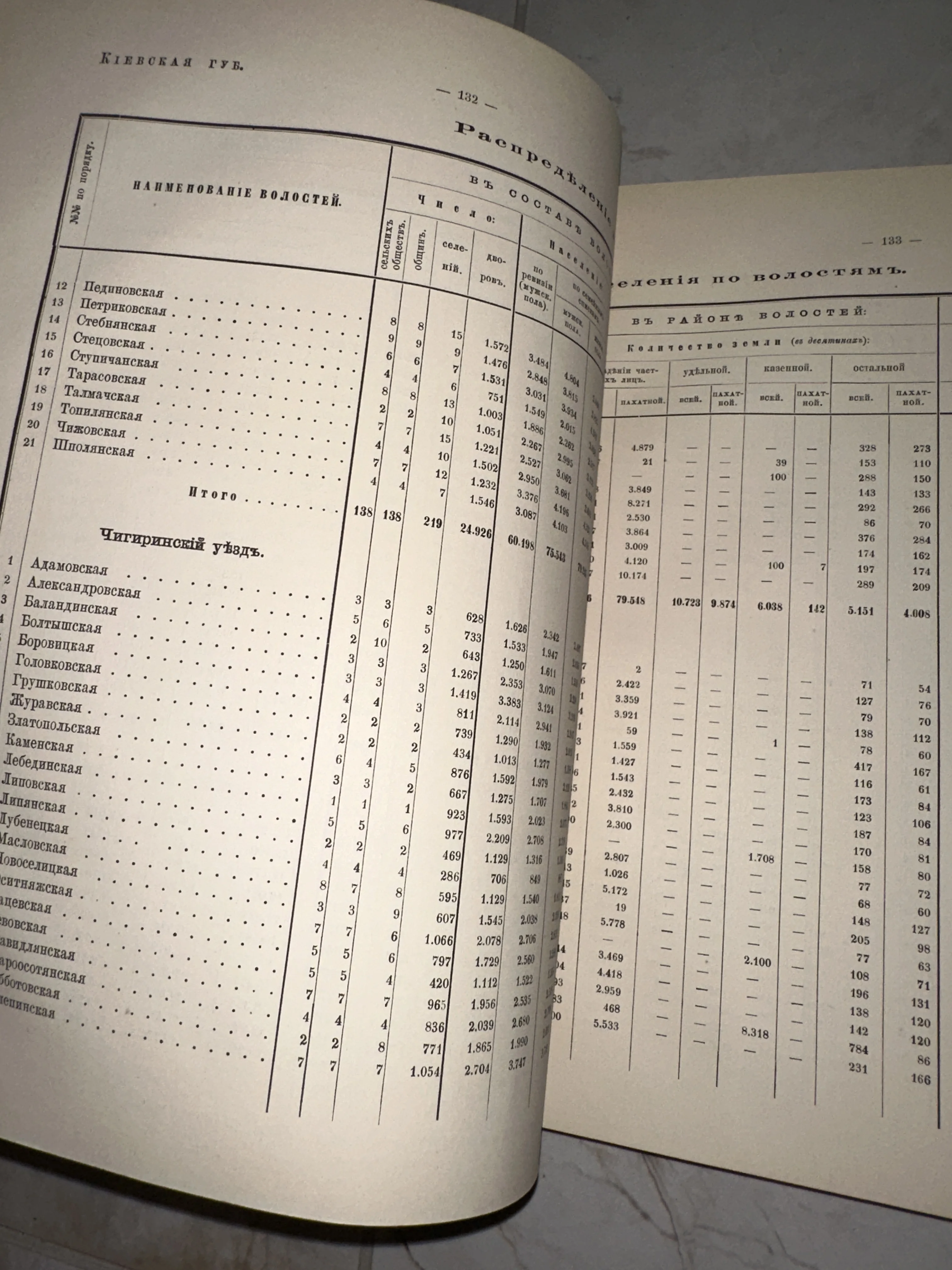 Уникальное документальное свидетельство эпохи, содержащее детальную статистику населения и распределение земель по волостям. Четкая дореволюционная печать и характерная патина времени подчеркивают аутентичность этого ценного исторического источника, незаменимого для исследователей и генеалогов.