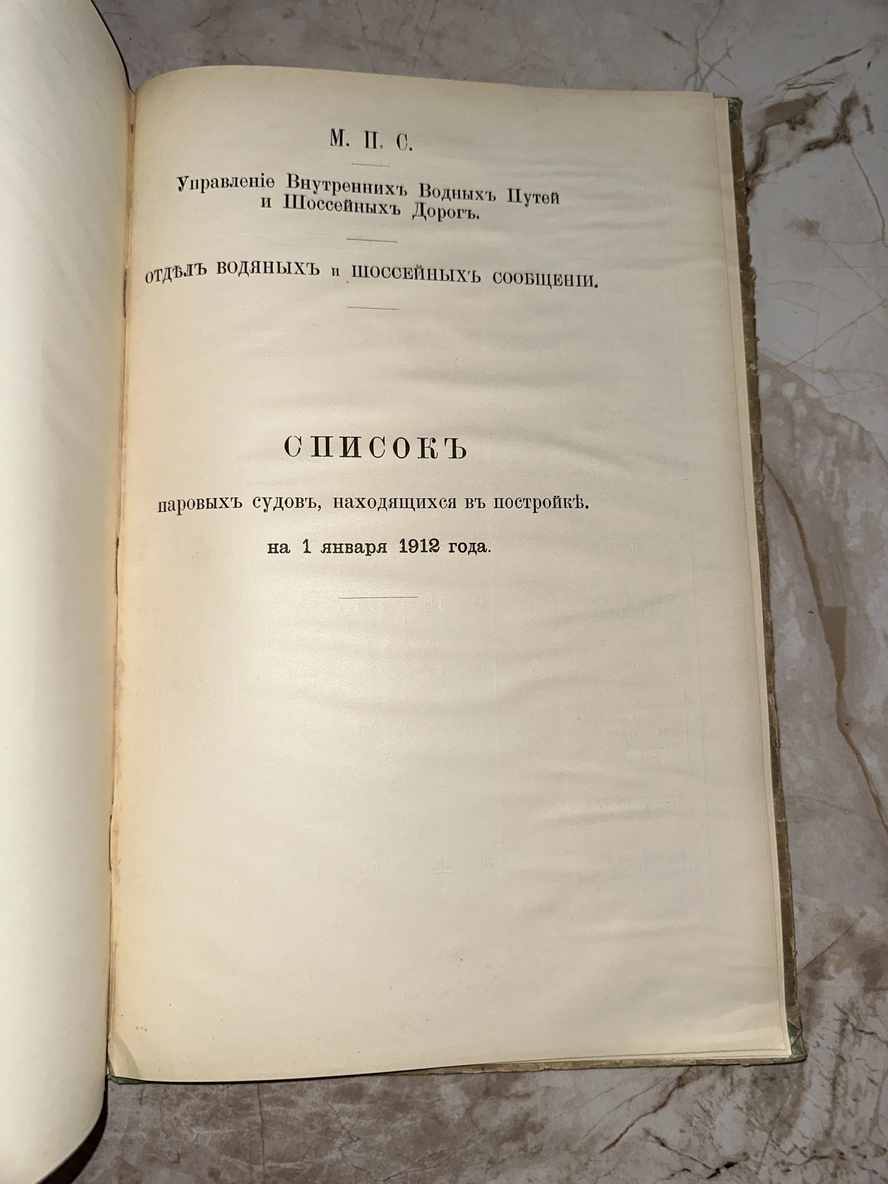 Титульный лист антикварного ведомственного издания 1912 года о строящихся паровых судах Министерства путей сообщения.