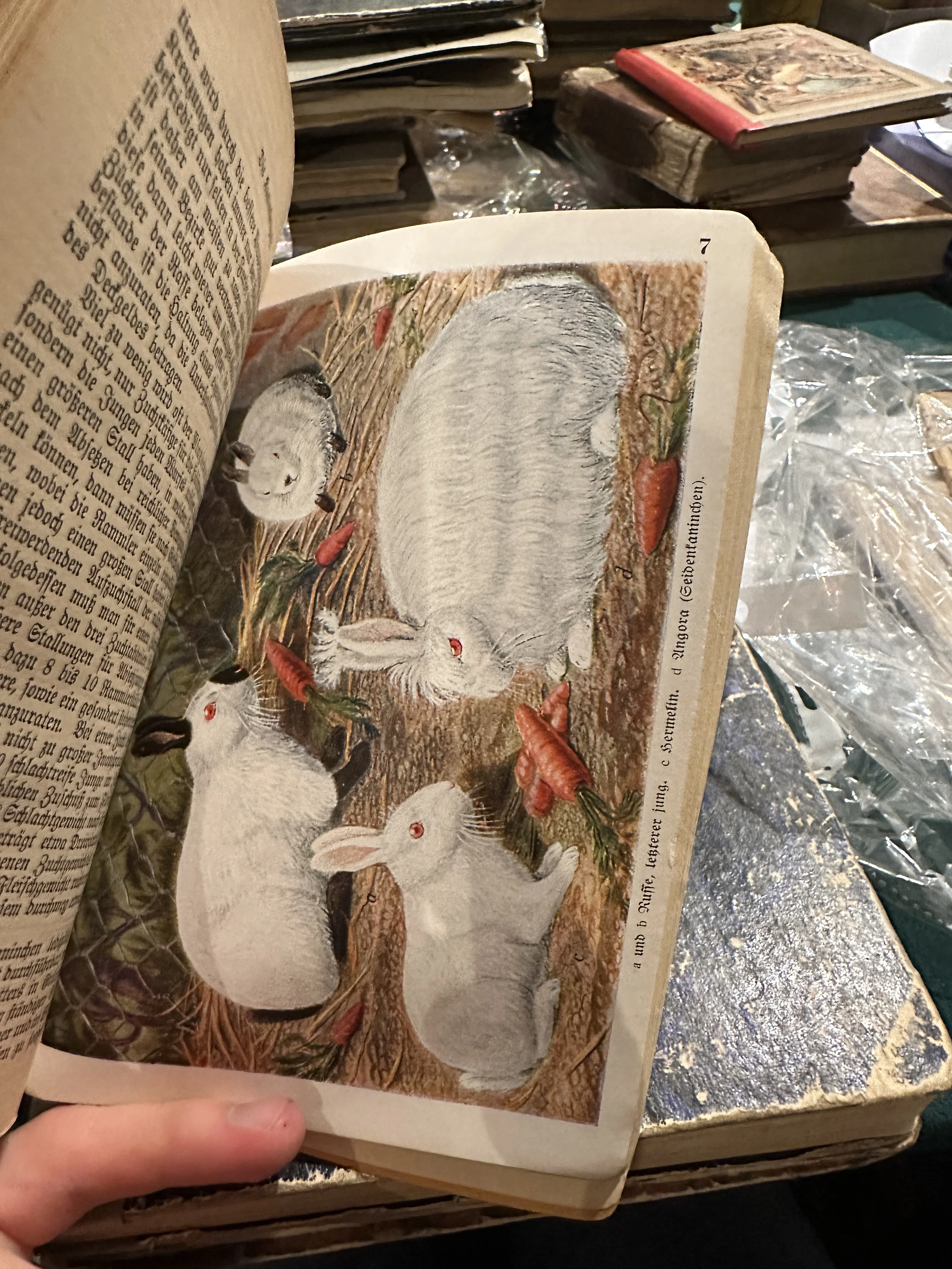 Разворот старинной книги на немецком языке с цветной литографией, изображающей белых ангорских кроликов и морковь.