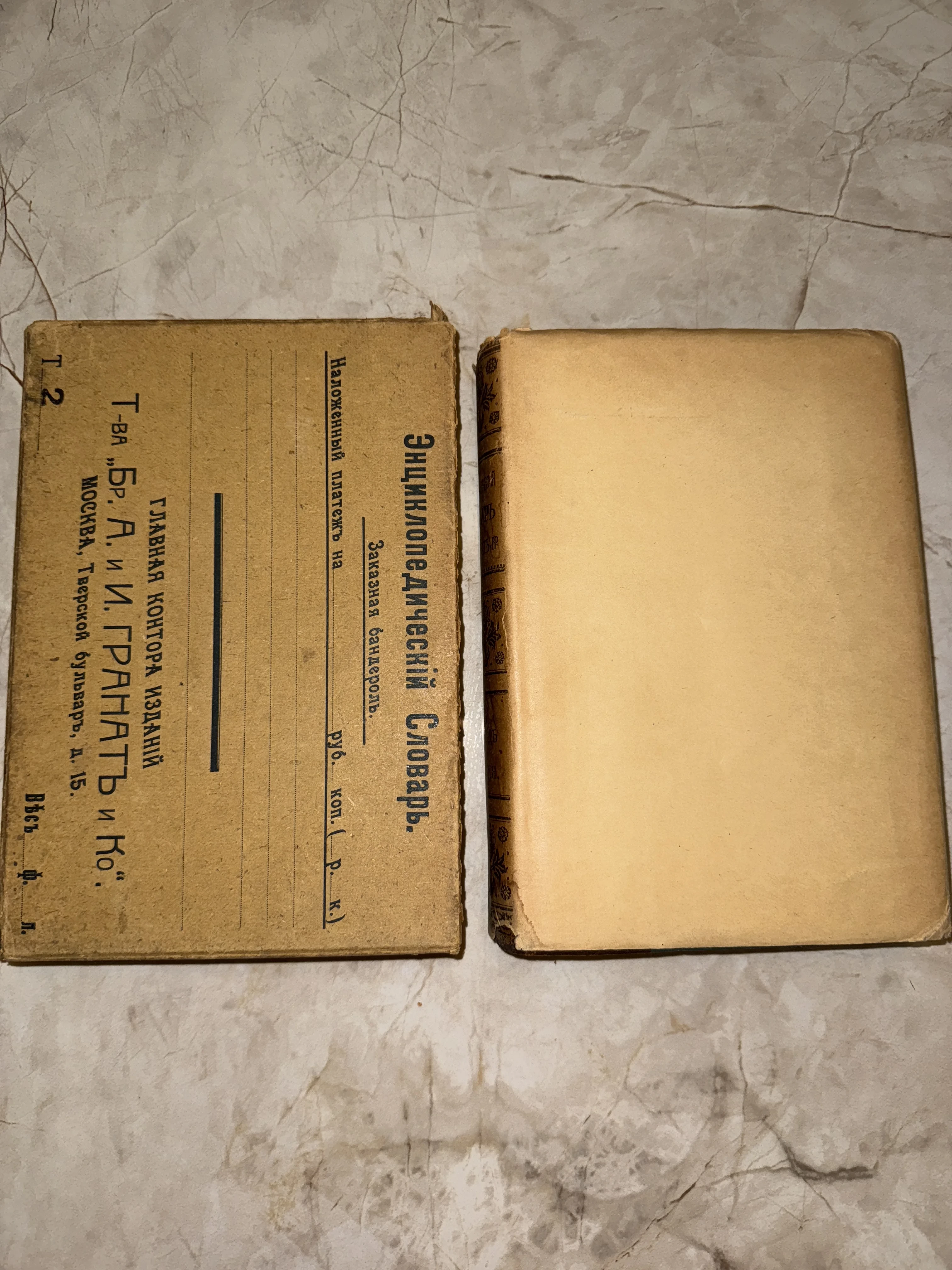 Перед вами подлинный образец книгоиздательского дела дореволюционной России — знаменитый словарь братьев Гранат. На обложке сохранились уникальные типографские пометки главной конторы издательства на Тверском бульваре, подчеркивающие историческую аутентичность и коллекционную ценность экземпляра.
