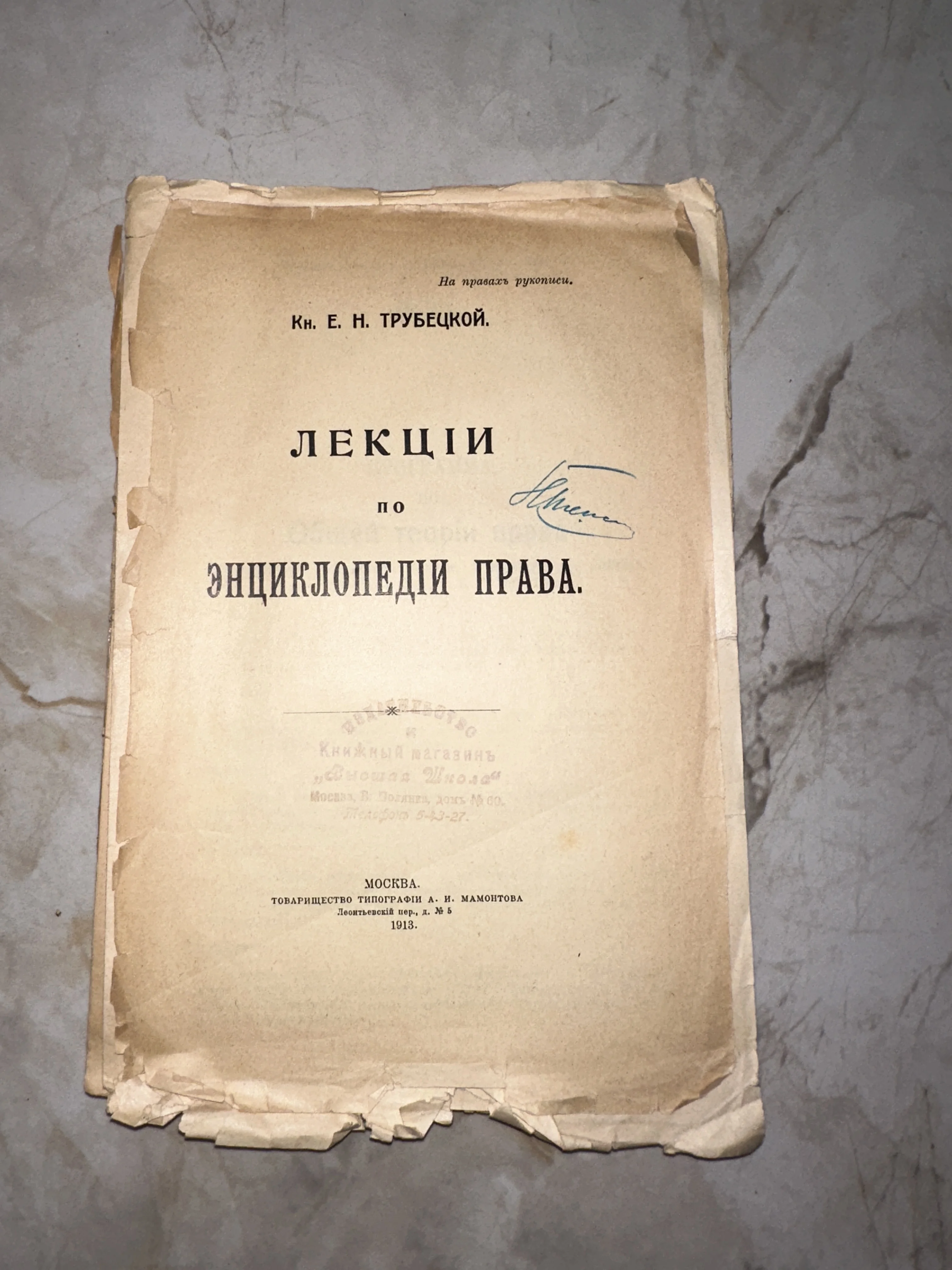 Титульный лист антикварной книги лекций по энциклопедии права князя Трубецкого, изданной в 1913 году в Москве.