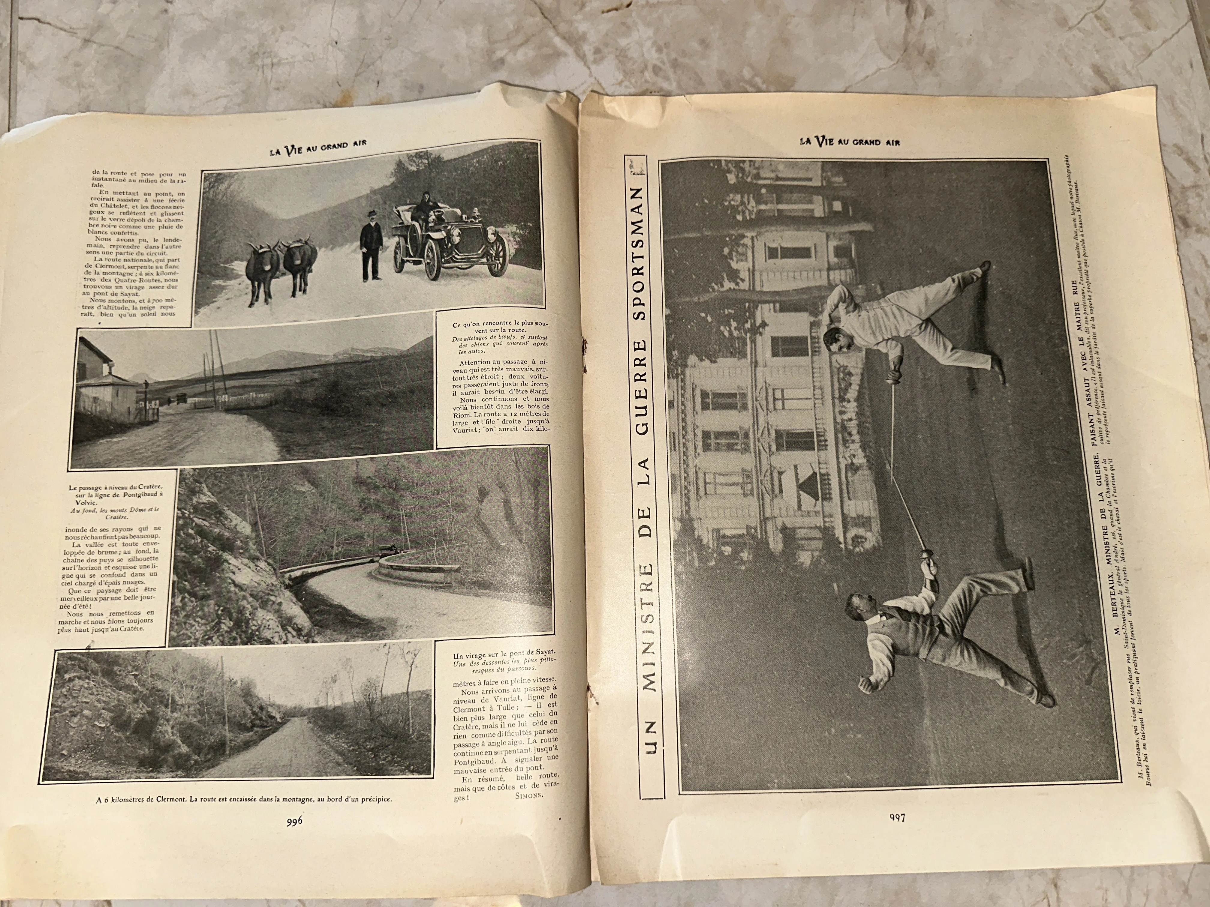 Страницы старинного французского журнала с фотографиями первых автомобилей, горных пейзажей и сцены фехтования.