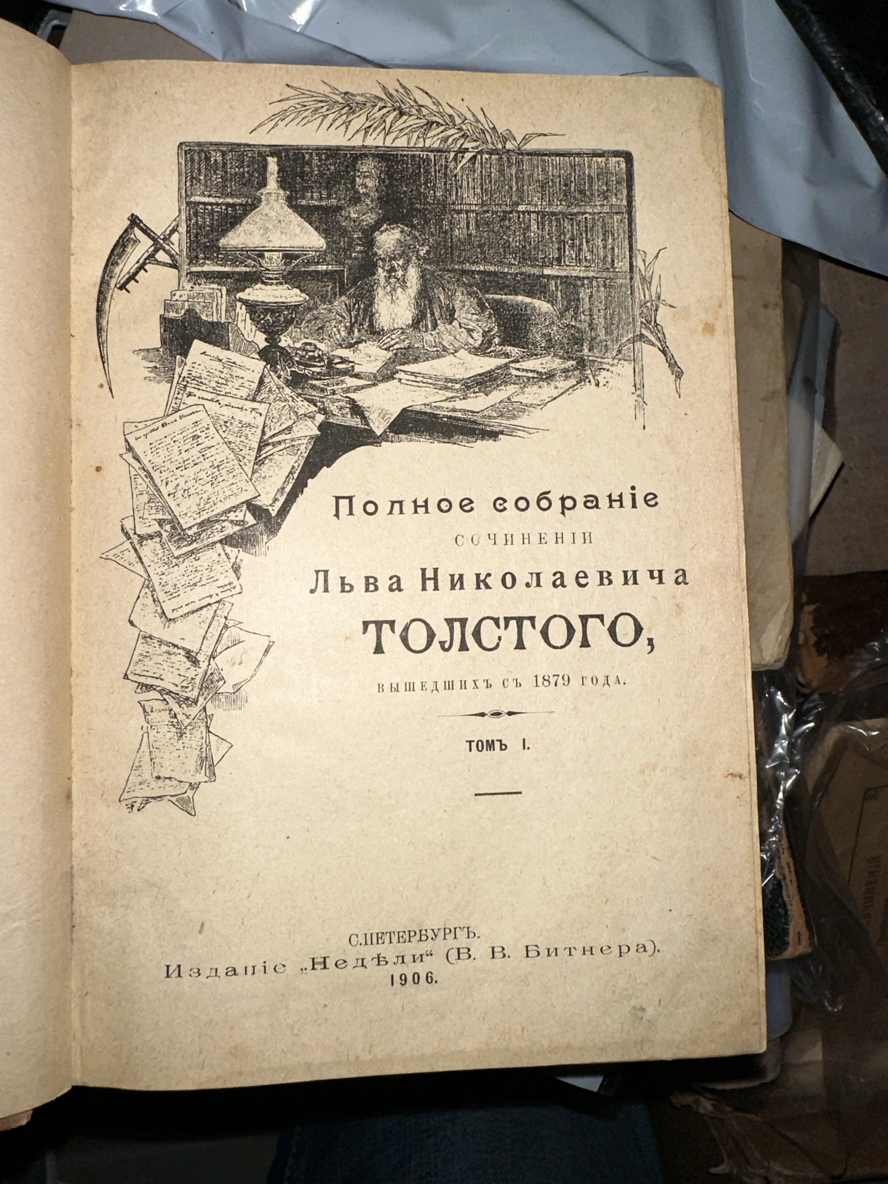 Уникальное антикварное издание, выпущенное в Санкт-Петербурге книгоиздательством «Неделя» под редакцией В. В. Битнера. Титульный лист украшен детальной гравюрой, изображающей Льва Николаевича Толстого за работой в окружении книг и рукописей. Прекрасный образец дореволюционной типографики с характерной патиной времени, представляющий высокую коллекционную ценность.