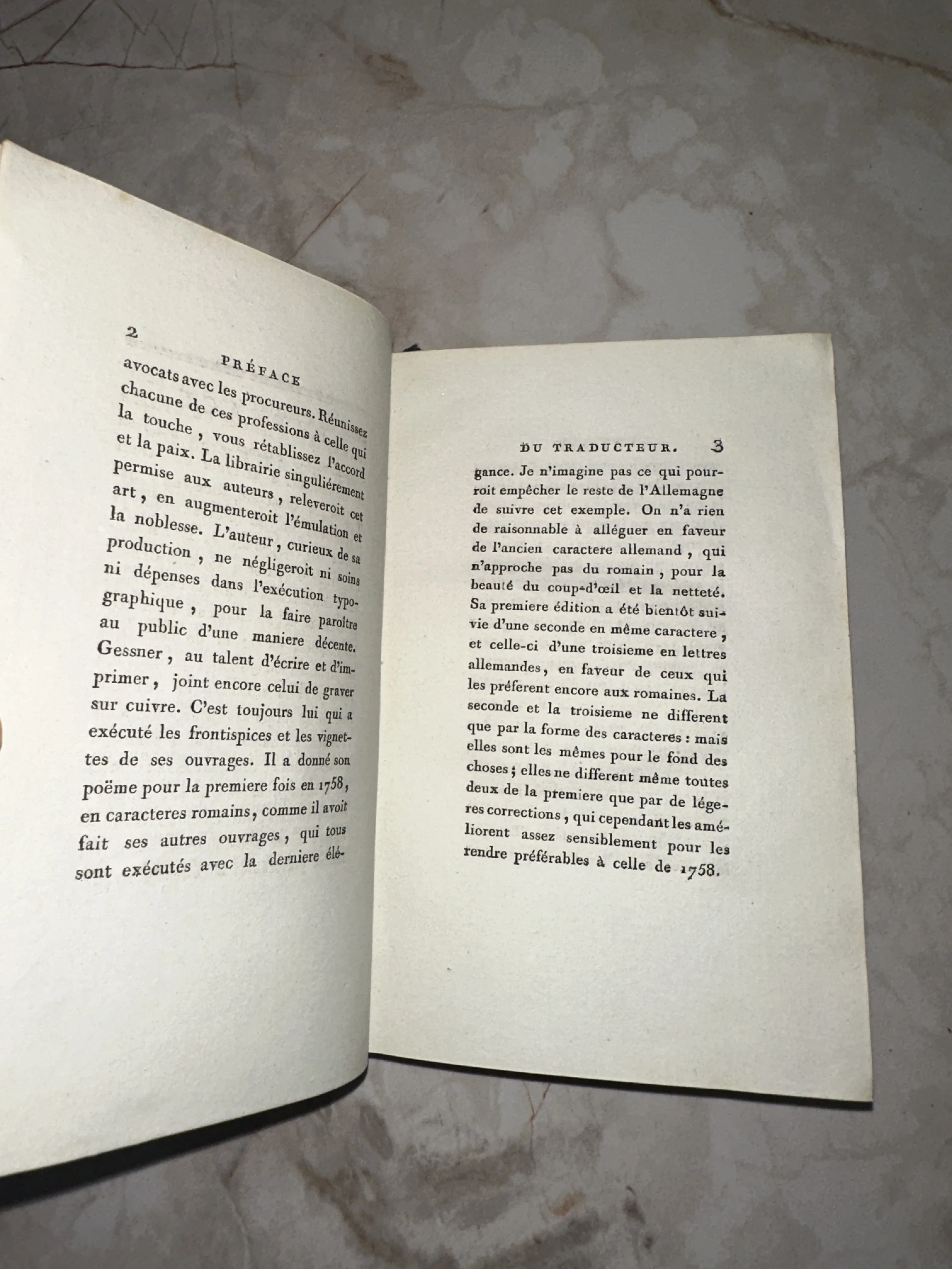 Элегантный разворот антикварного тома с четким типографским шрифтом на плотной бумаге верже. Текст предисловия содержит отсылки к изданиям 1758 года и упоминает знаменитого швейцарского поэта Соломона Гесснера. Превосходная сохранность страниц подчеркивает коллекционную ценность этого исторического экземпляра.