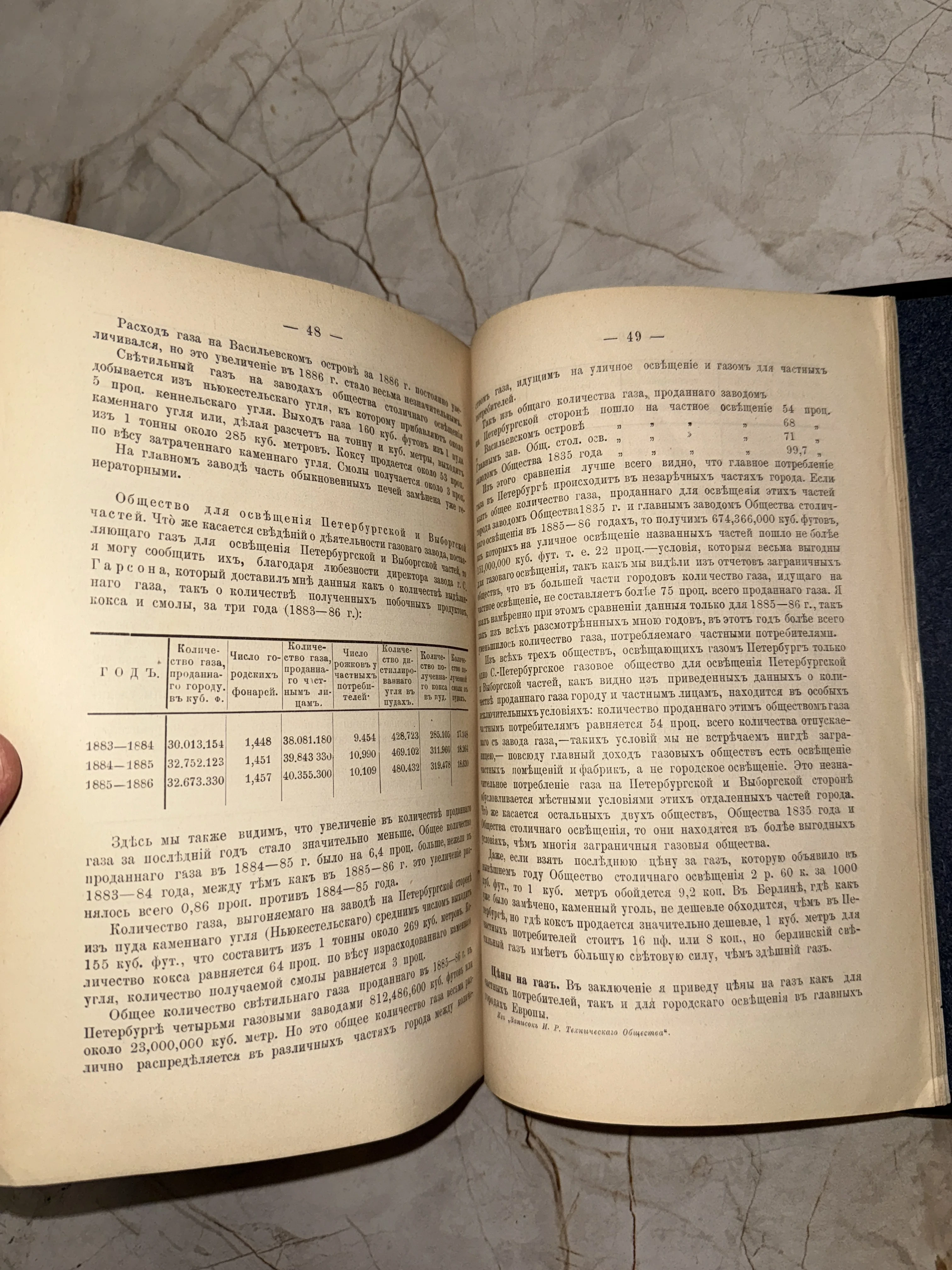 Разворот старинной книги со страницами 48 и 49, содержащий текст и таблицу о расходе газа на Васильевском острове в 1883-1886 годах.