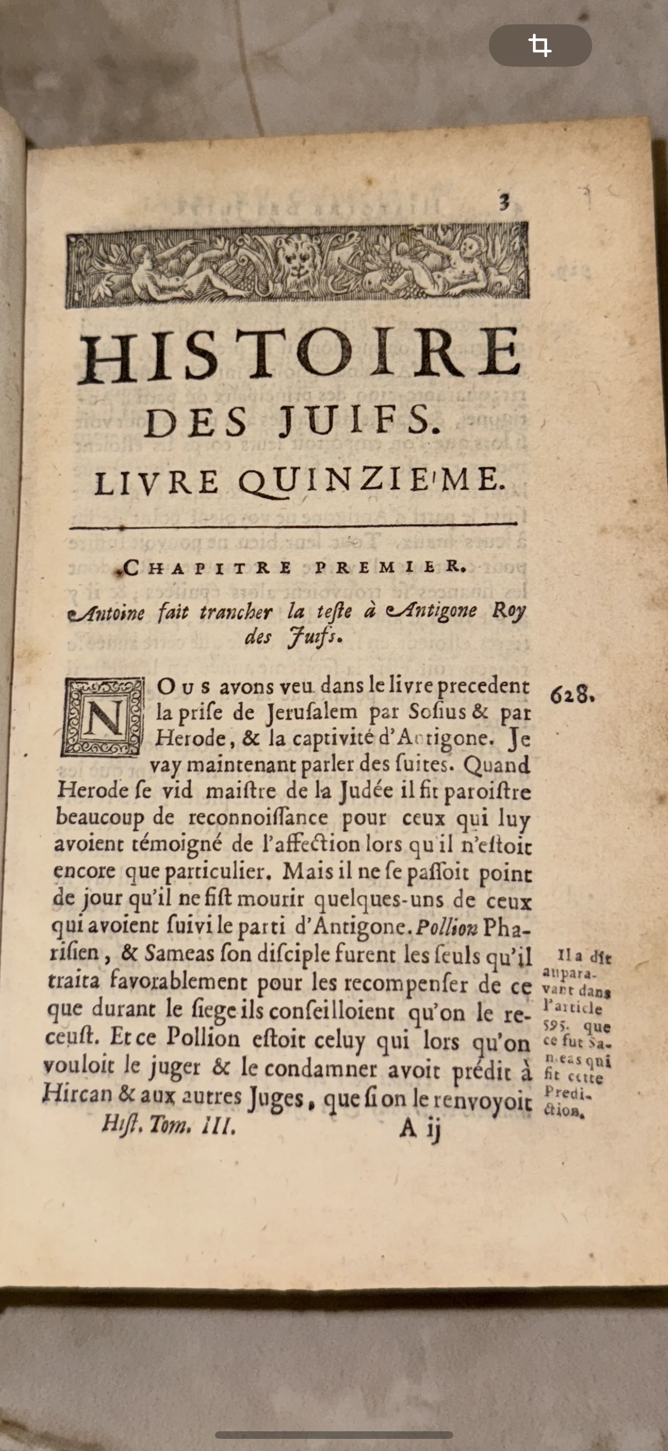 Старинная книжная страница с заголовком Histoire des Juifs, украшенная гравюрным фризом и декоративной буквицей.