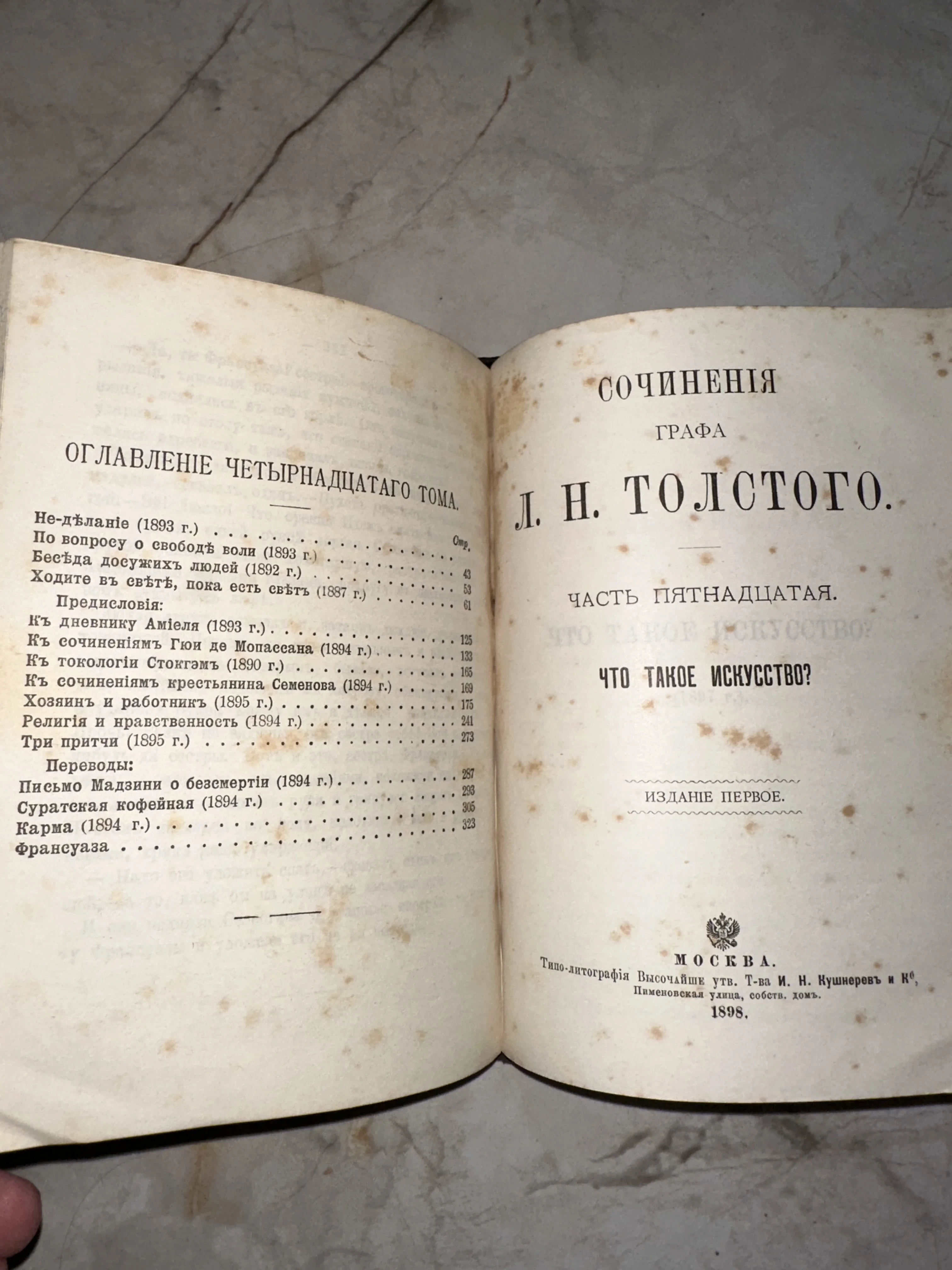 Разворот антикварной книги Льва Толстого 1898 года с титульным листом «Что такое искусство?» и оглавлением 14 тома.