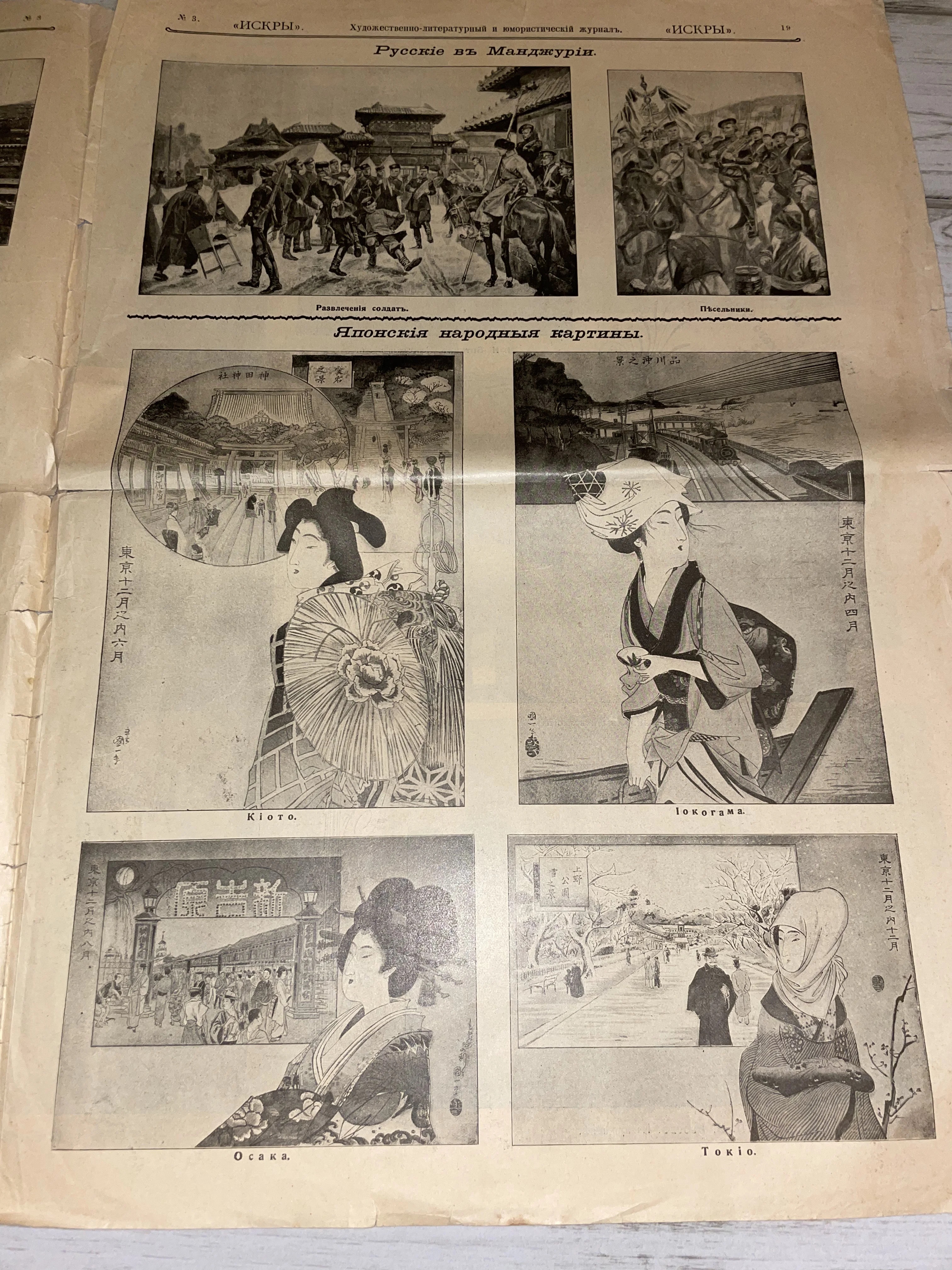 Редкая страница иллюстрированного журнала начала XX века, представляющая собой удивительное соседство военной хроники и восточной эстетики. На пожелтевшей бумаге запечатлены репортажные зарисовки из жизни русской армии в Манчжурии и изящные японские народные картины, передающие колорит городов периода Мэйдзи. Артефакт обладает высокой коллекционной ценностью как документ эпохи Русско-японской войны.