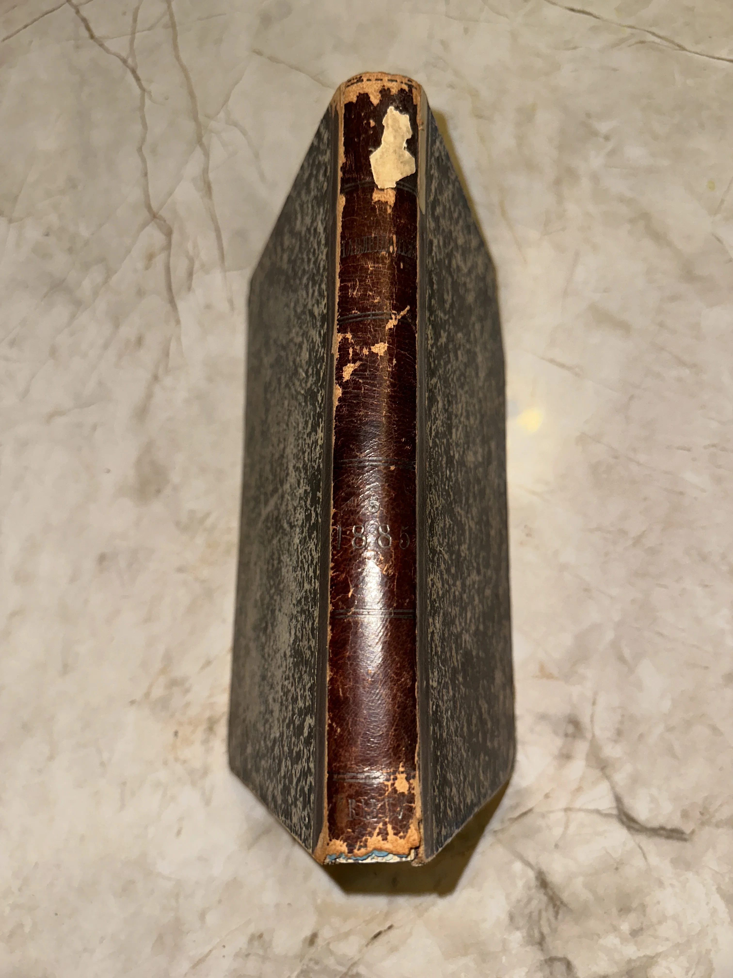 Изящный образец книжного дела XIX столетия с благородной патиной времени на кожаном корешке. Тисненая дата «1885» и естественные потертости подчеркивают подлинность и богатую историю этого коллекционного экземпляра, который станет украшением любой библиотеки.