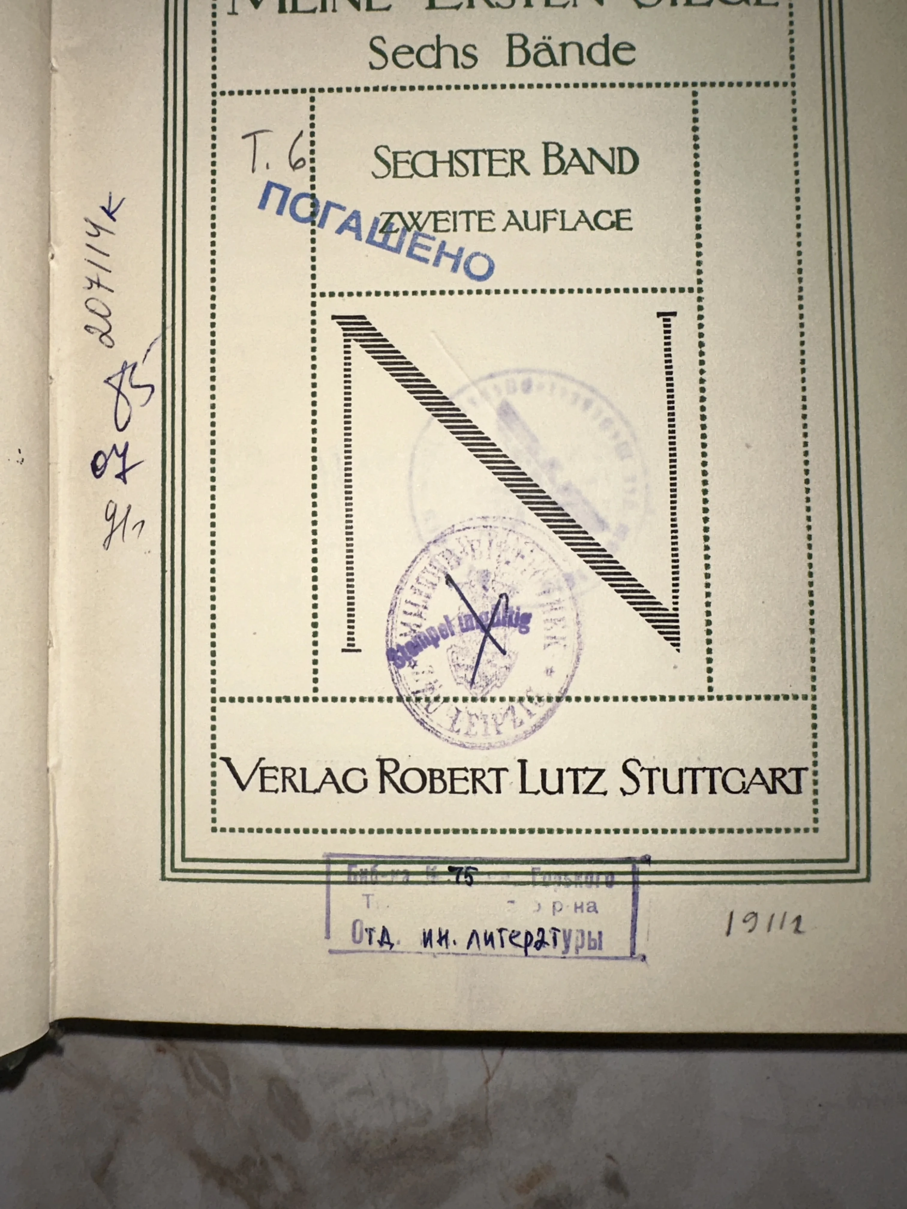 Перед вами подлинный артефакт книжной истории — титульный лист шестого тома немецкого издания начала XX века из Штутгарта. Особую ценность предмету придают следы времени: оригинальная типографика соседствует с советскими библиотечными штампами и рукописными пометками, рассказывая о путешествии книги сквозь границы и эпохи. Сохранность бумаги и четкость шрифта позволяют прочувствовать эстетику старой Европы.