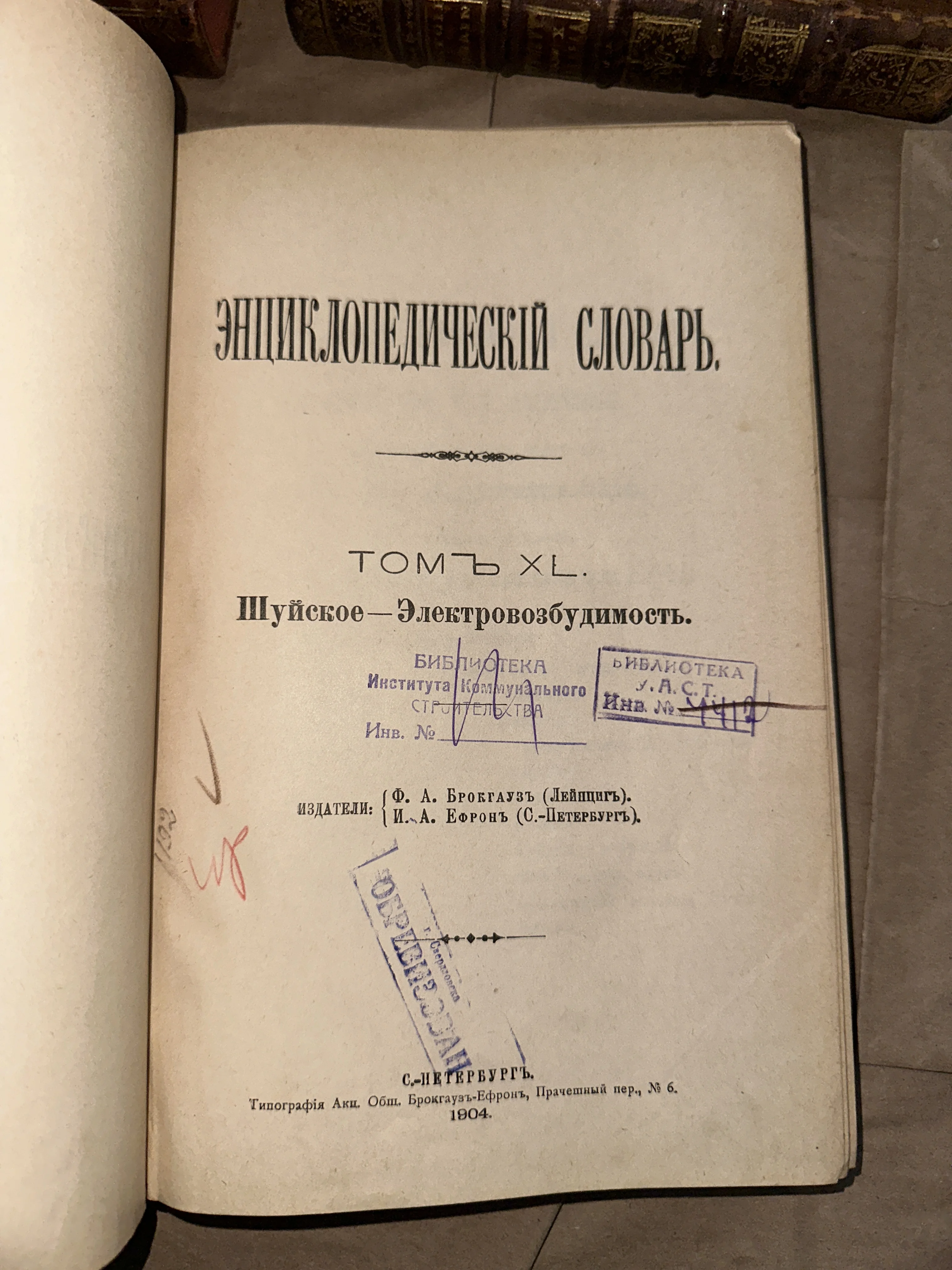 Перед вами подлинный титульный лист сорокового тома знаменитого словаря Брокгауза и Ефрона, изданный в Санкт-Петербурге в 1904 году. Книга хранит на себе печать времени в виде аутентичных библиотечных штампов и рукописных пометок, подчеркивающих её богатую историю. Желтоватая плотная бумага и классическая дореволюционная типографика делают этот экземпляр ценным артефактом для коллекционеров и любителей истории.