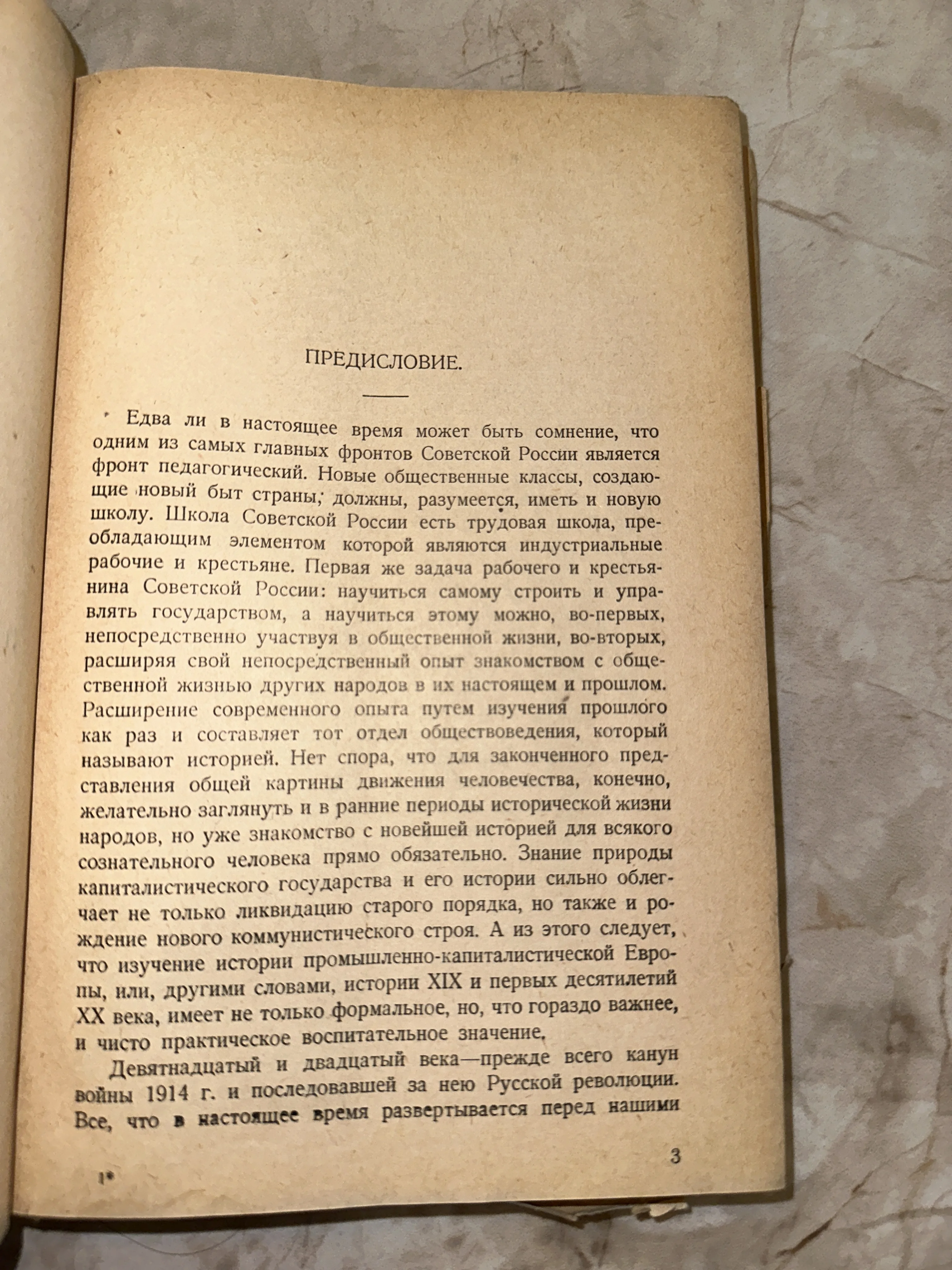 Разворот старой книги на пожелтевшей бумаге с заголовком Предисловие и текстом о педагогике в Советской России.
