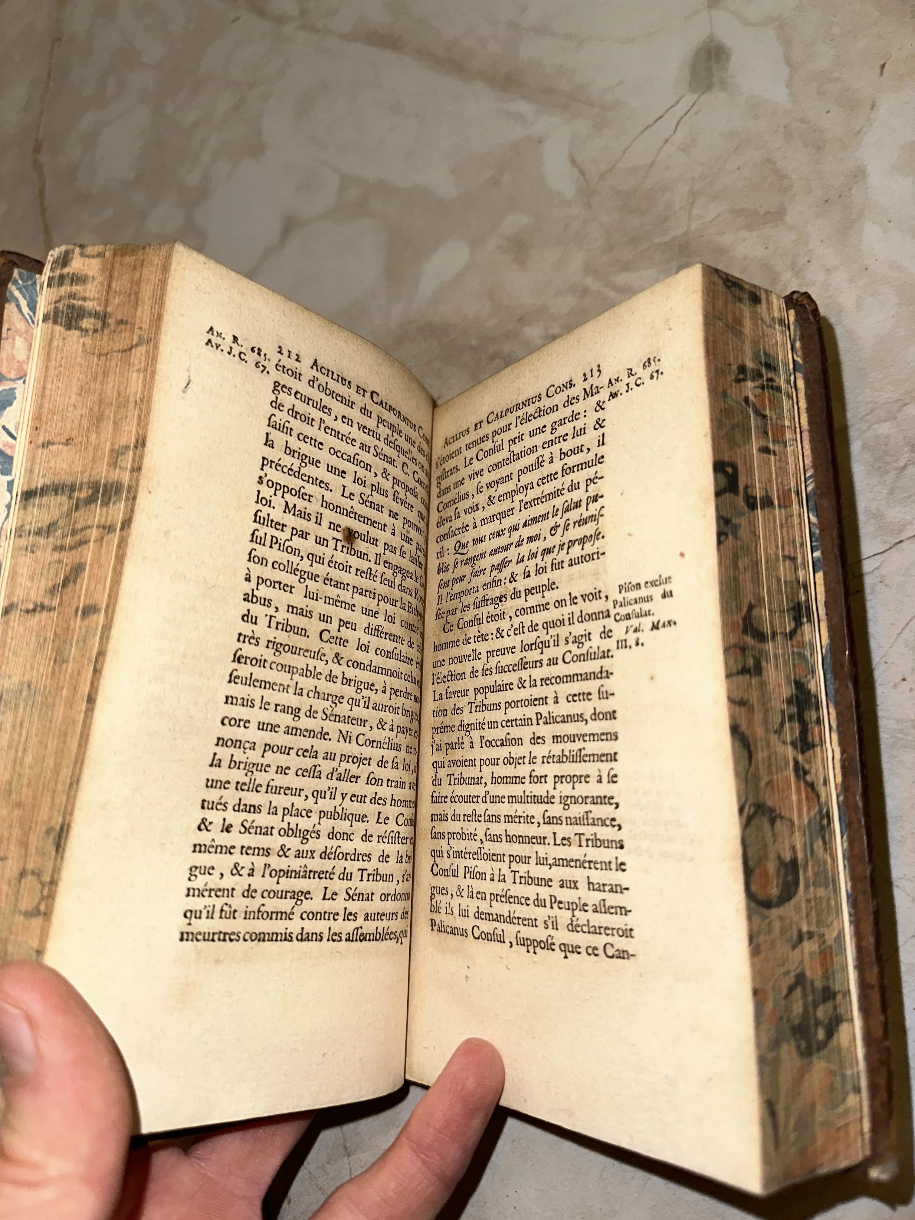 Редкое историческое издание, посвященное консулам Древнего Рима, напечатанное на плотной бумаге с характерной патиной времени. Книга отличается изящной типографикой XVIII века и декоративными узорчатыми форзацами, подчеркивающими её благородное происхождение. Этот экземпляр станет ценным приобретением для ценителей европейской классики и любителей античной истории.