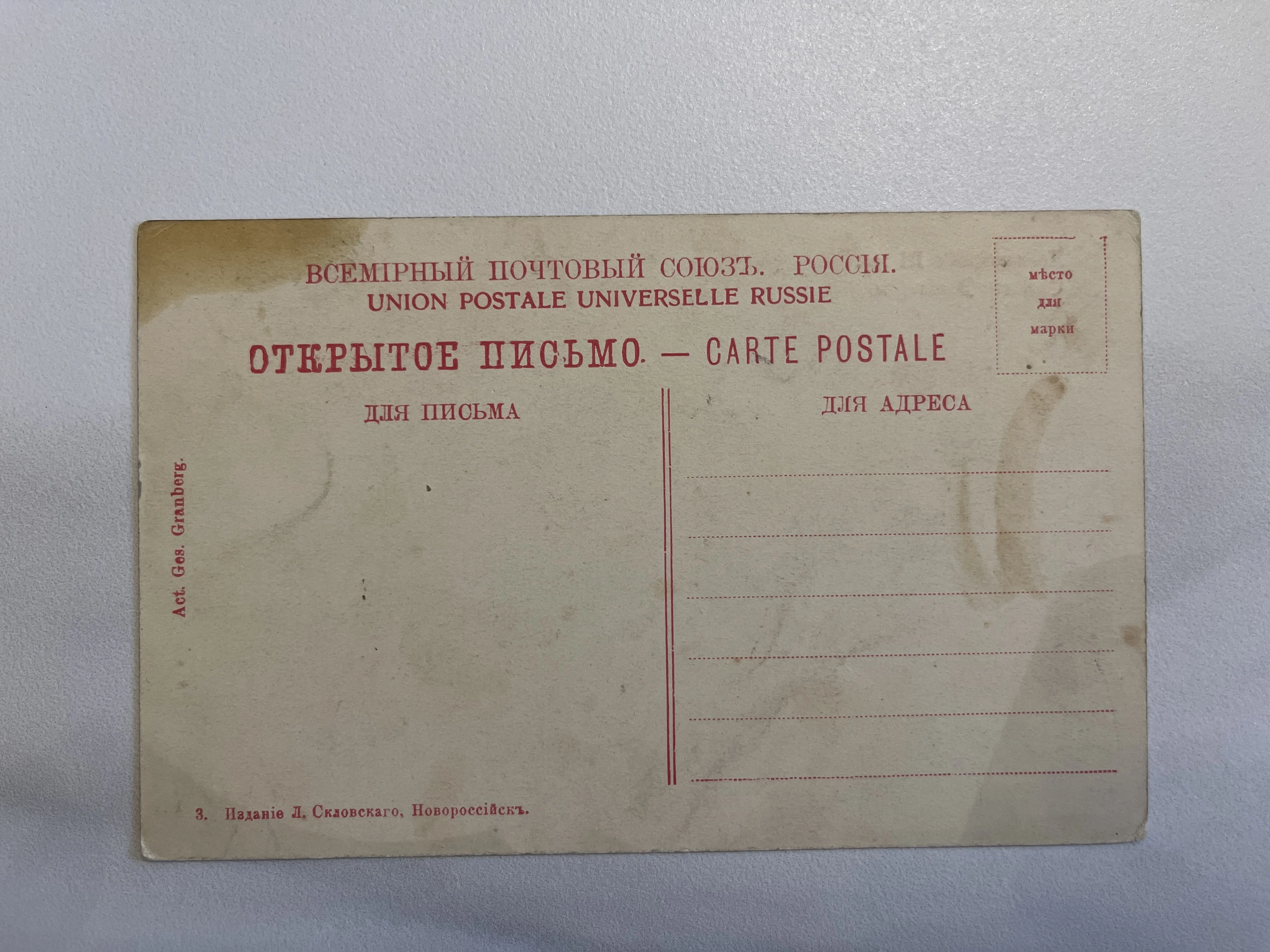 Редкий экземпляр неиспользованного бланка «Открытого письма» начала XX века, выпущенный издательством Л. Скловского в Новороссийске. Благородное пожелтение бумаги и дореволюционный шрифт с тиснением передают подлинную атмосферу почтовой переписки имперской эпохи.