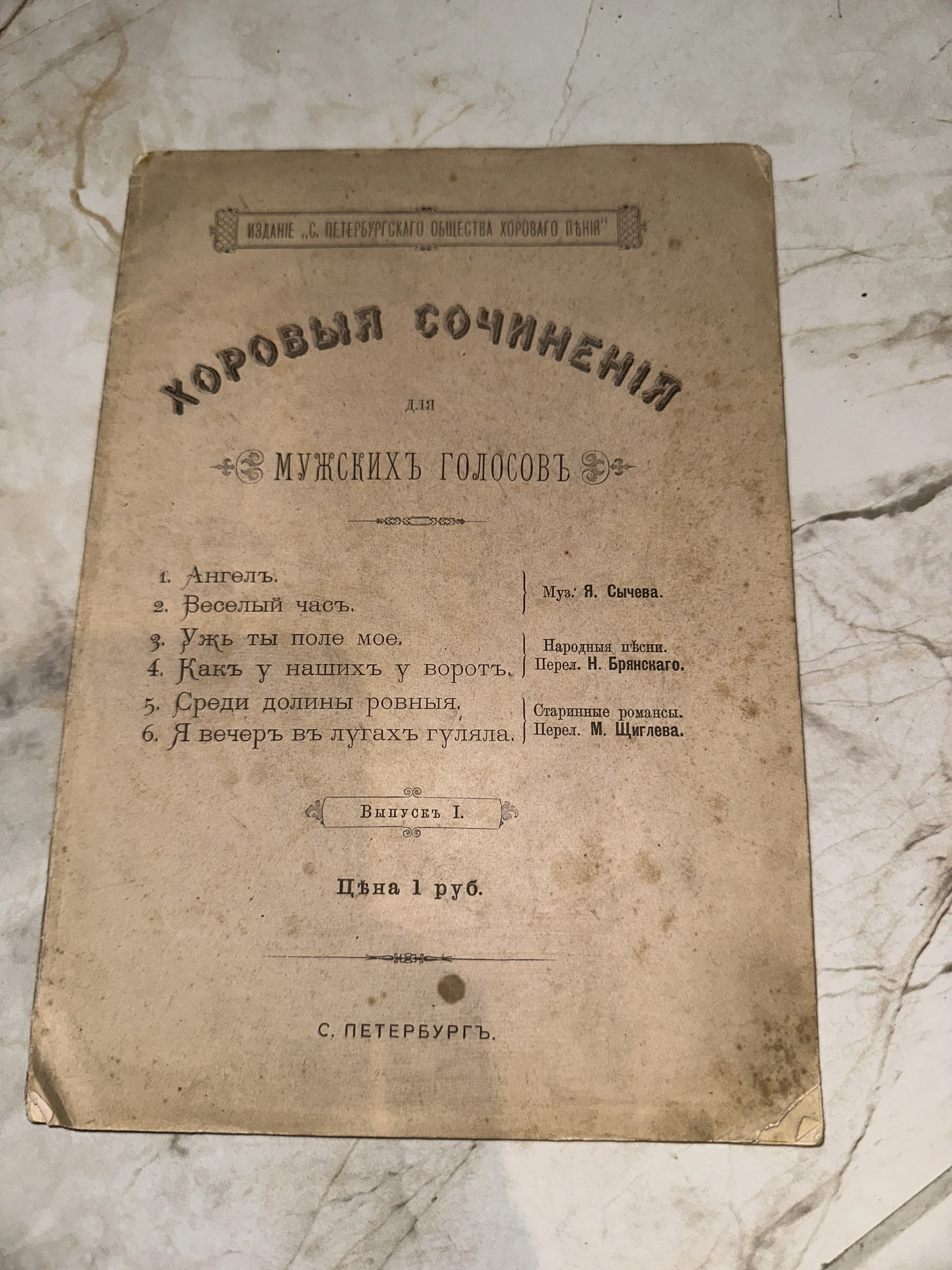 Перед вами редкий экземпляр нотной печати конца XIX века, выпущенный Санкт-Петербургским обществом хорового пения. Сборник включает в себя народные песни и старинные романсы, сохранив дух музыкальной культуры императорской России. Благородная патина времени и дореволюционная орфография придают изданию особую коллекционную ценность.