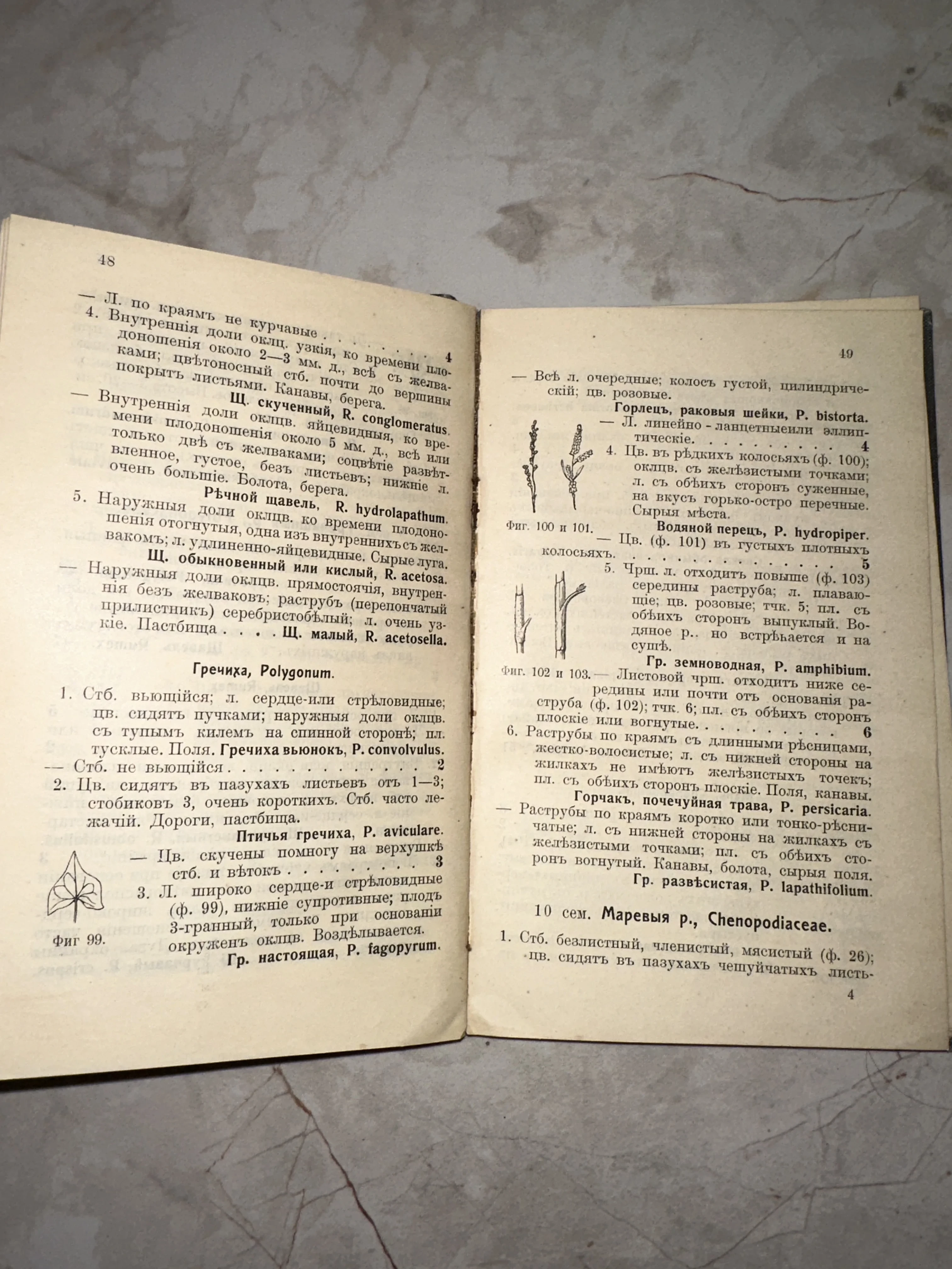 Разворот старинной книги с ботаническими описаниями растений семейства Гречишные и Маревые на дореволюционном русском языке.