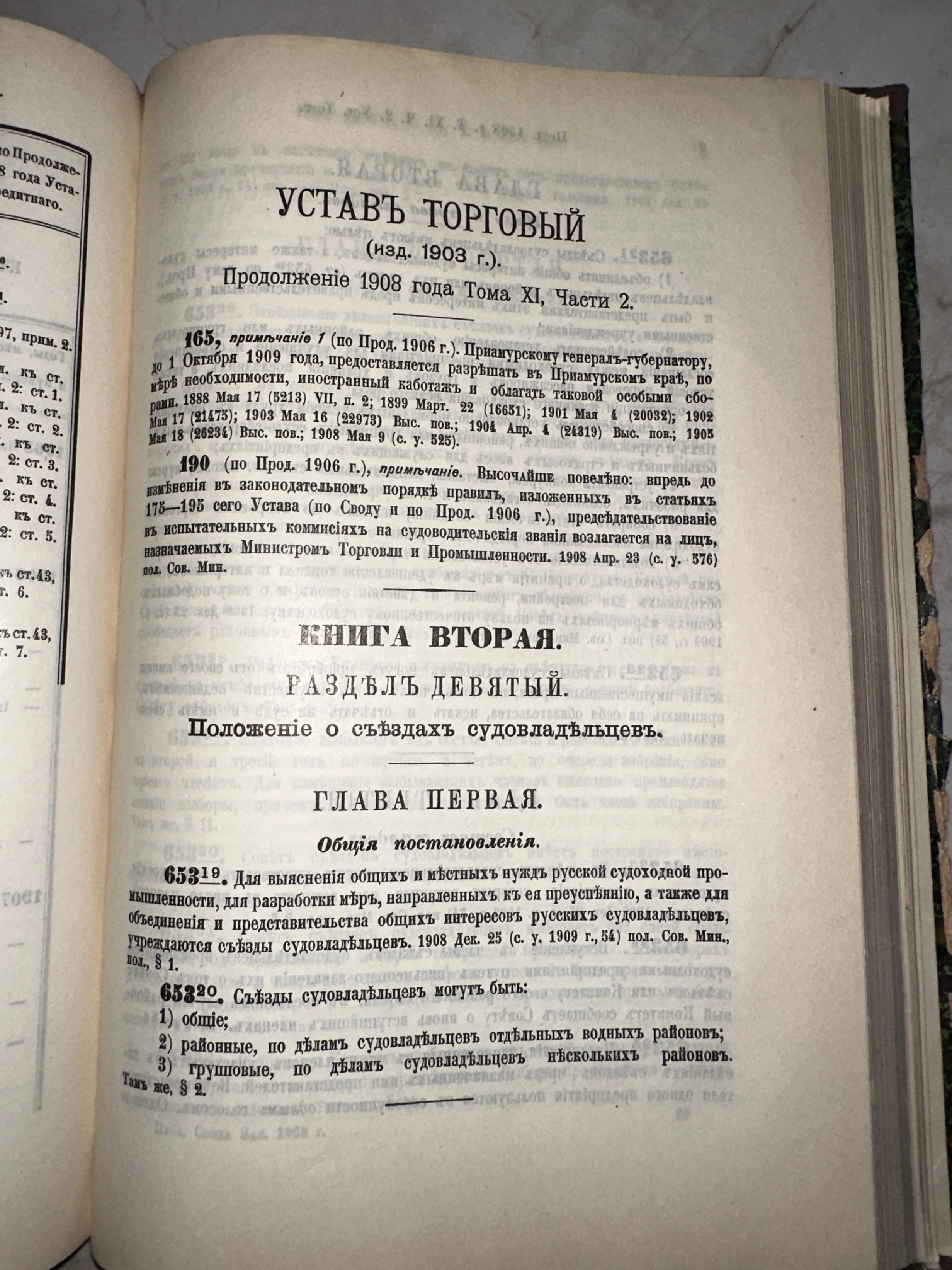 Редкий образец юридической литературы начала XX века, содержащий свод правил торгового права и статьи о съездах судовладельцев. Благородная патина на страницах и сохранившаяся четкость типографского шрифта подчеркивают подлинность и историческую значимость этого документа. Прекрасное приобретение для коллекции антикварных книг или кабинета юриста.