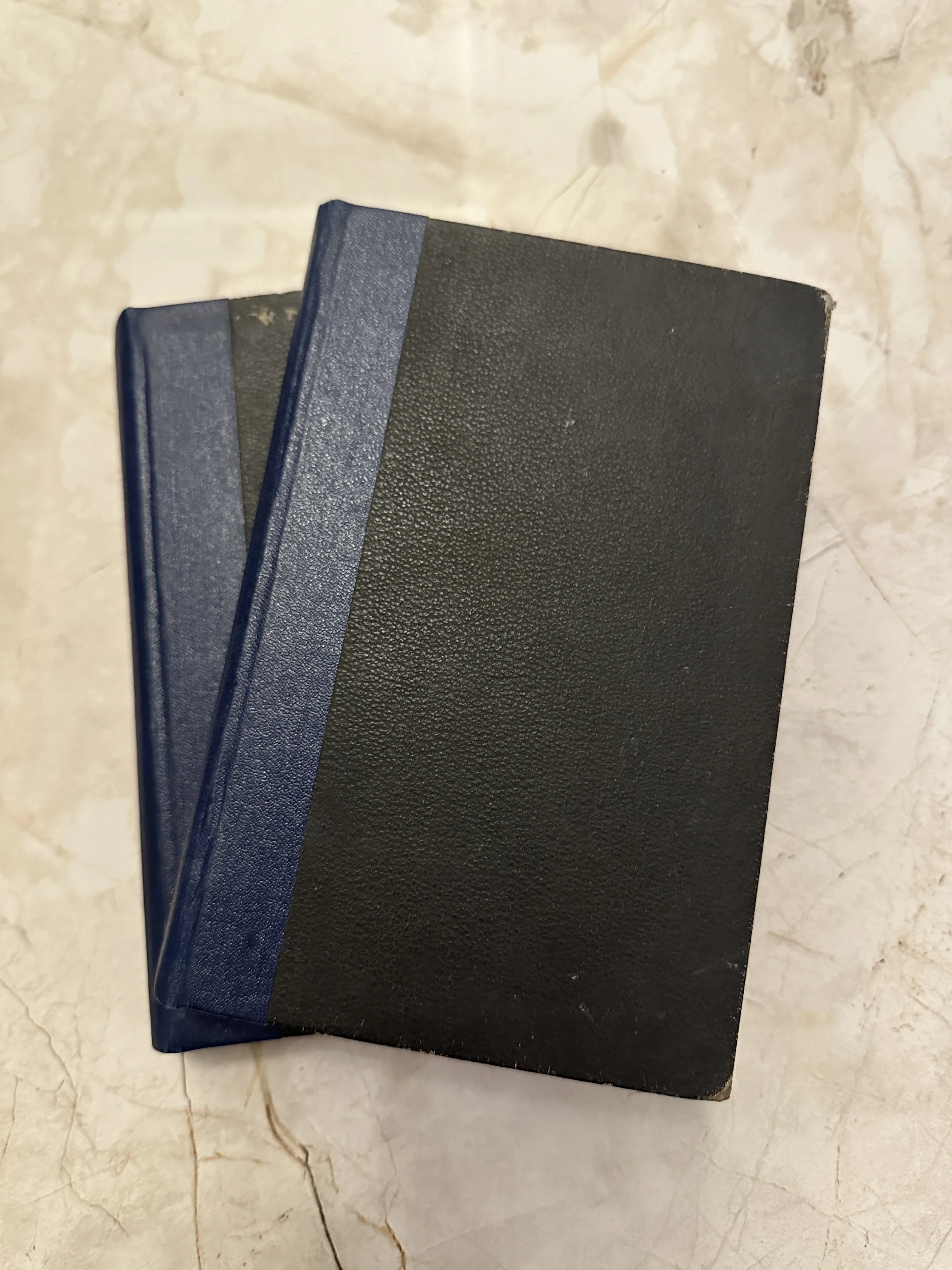 Элегантный дуэт томов, выполненный в классическом составном переплете с использованием благородного синего коленкора и глубокой черной бумаги. Лаконичный дизайн без лишних деталей и естественная патина времени придают этим книгам особый кабинетный шарм и аутентичность. Идеальный выбор для оформления интерьера в стиле ретро или пополнения частной библиотеки.