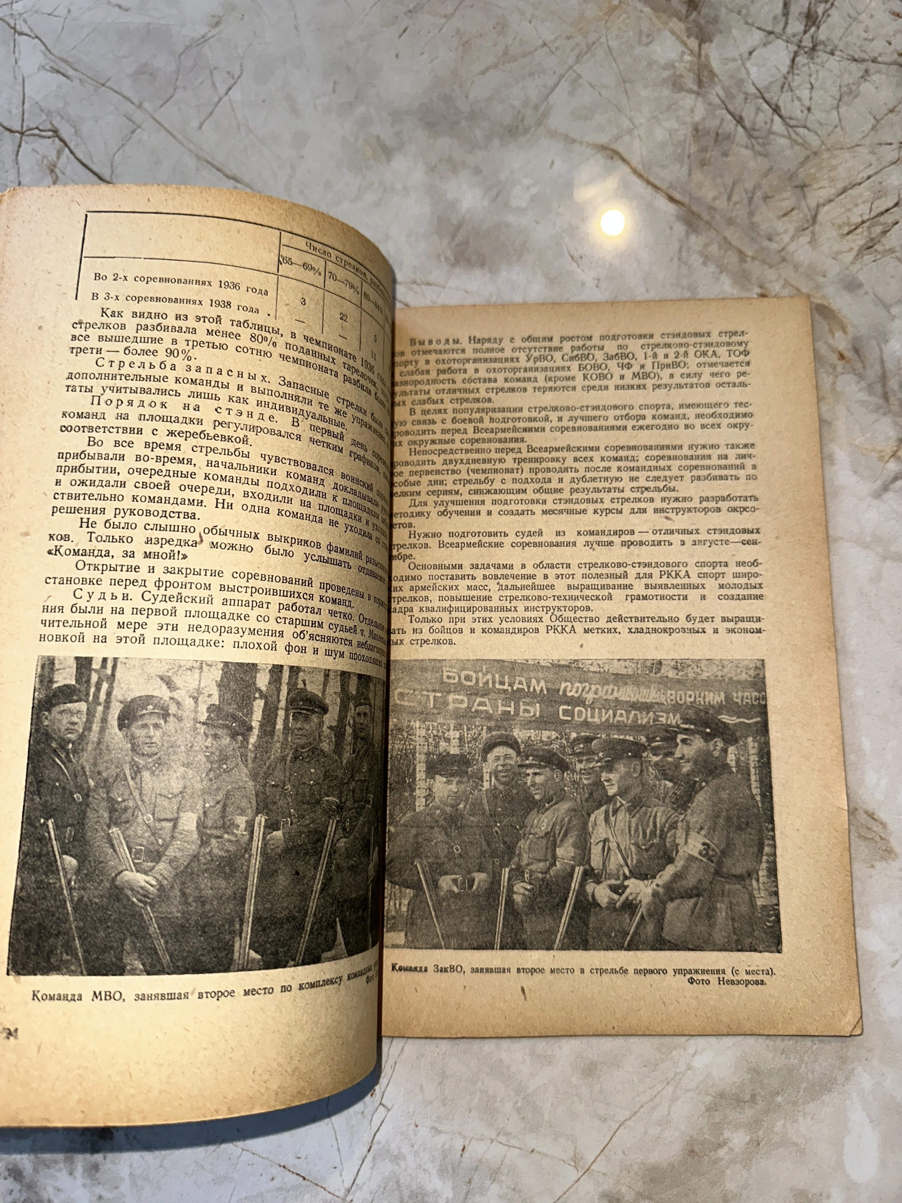 Уникальный разворот советского издания 1930-х годов, посвященного успехам стрелкового спорта в рядах РККА. Книга содержит редкие фотоснимки команд-победителей Московского и Закавказского военных округов. Желтоватая патина страниц и четкая типографская печать подчеркивают подлинность и коллекционную ценность этого исторического документа.