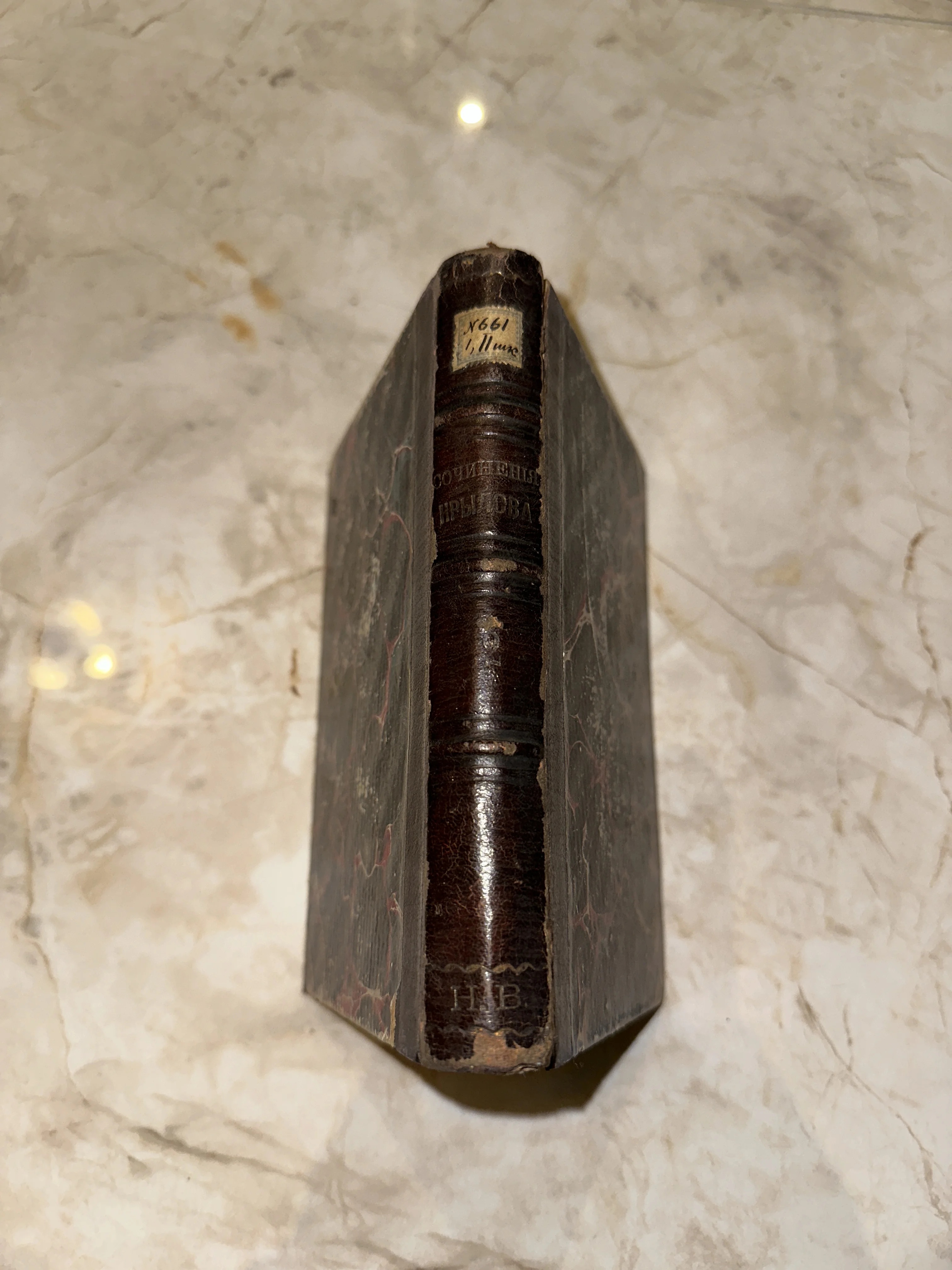 Перед вами подлинный свидетель литературной истории — старинный том сочинений великого баснописца И. А. Крылова в благородном полукожаном переплете. Время оставило на корешке изящную патину и характерные потертости, которые лишь подчеркивают коллекционную ценность и уникальный провенанс этого экземпляра. Золотое тиснение и сохранившийся библиотечный ярлык создают неповторимую атмосферу кабинетной классики XIX века.
