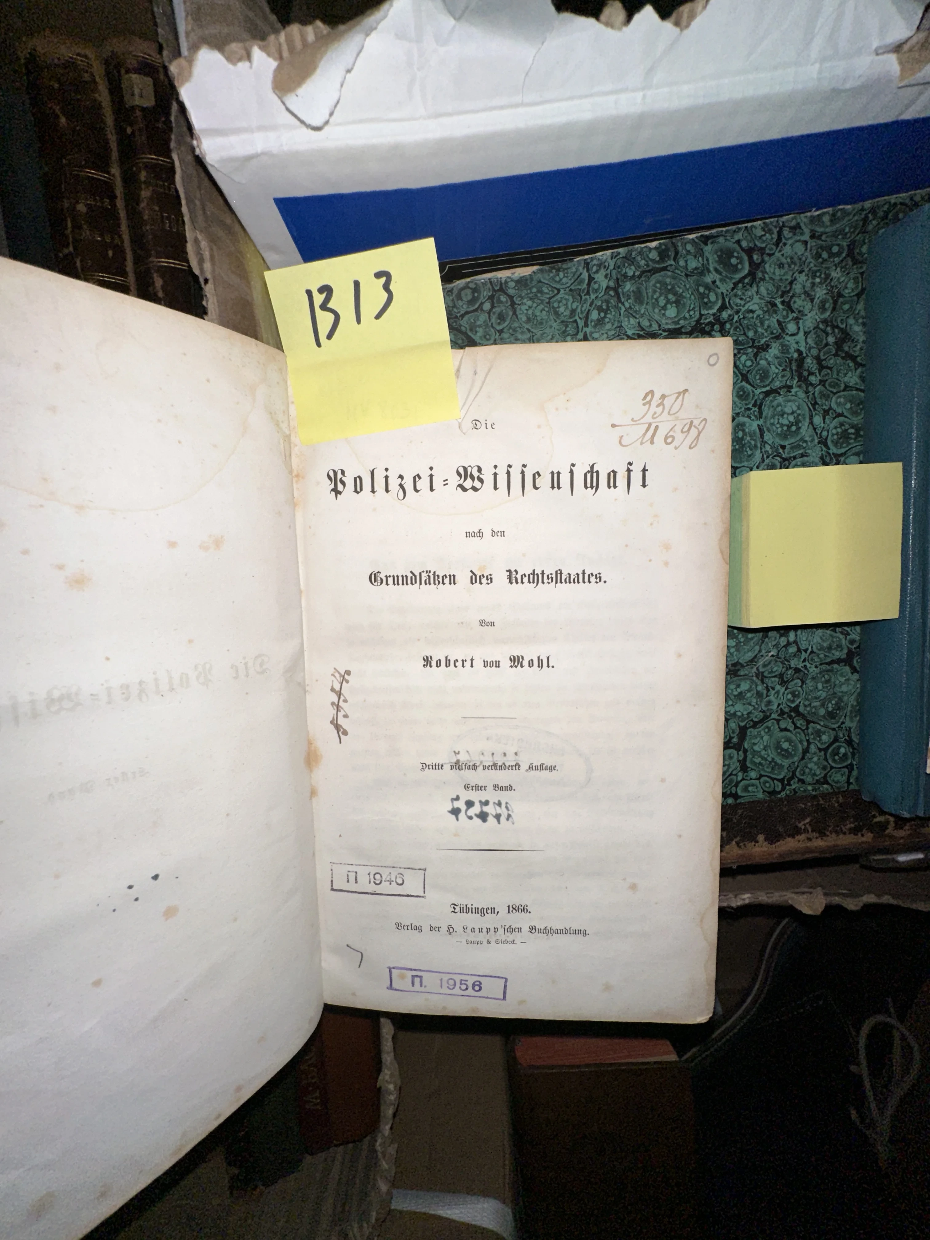 Перед вами фундаментальный труд Роберта фон Моля, заложивший основы концепции правового государства. Издание 1866 года напечатано выразительным готическим шрифтом и несёт на себе следы времени в виде благородной патины и архивных штампов, что делает его ценным экземпляром для коллекционеров юридической литературы.