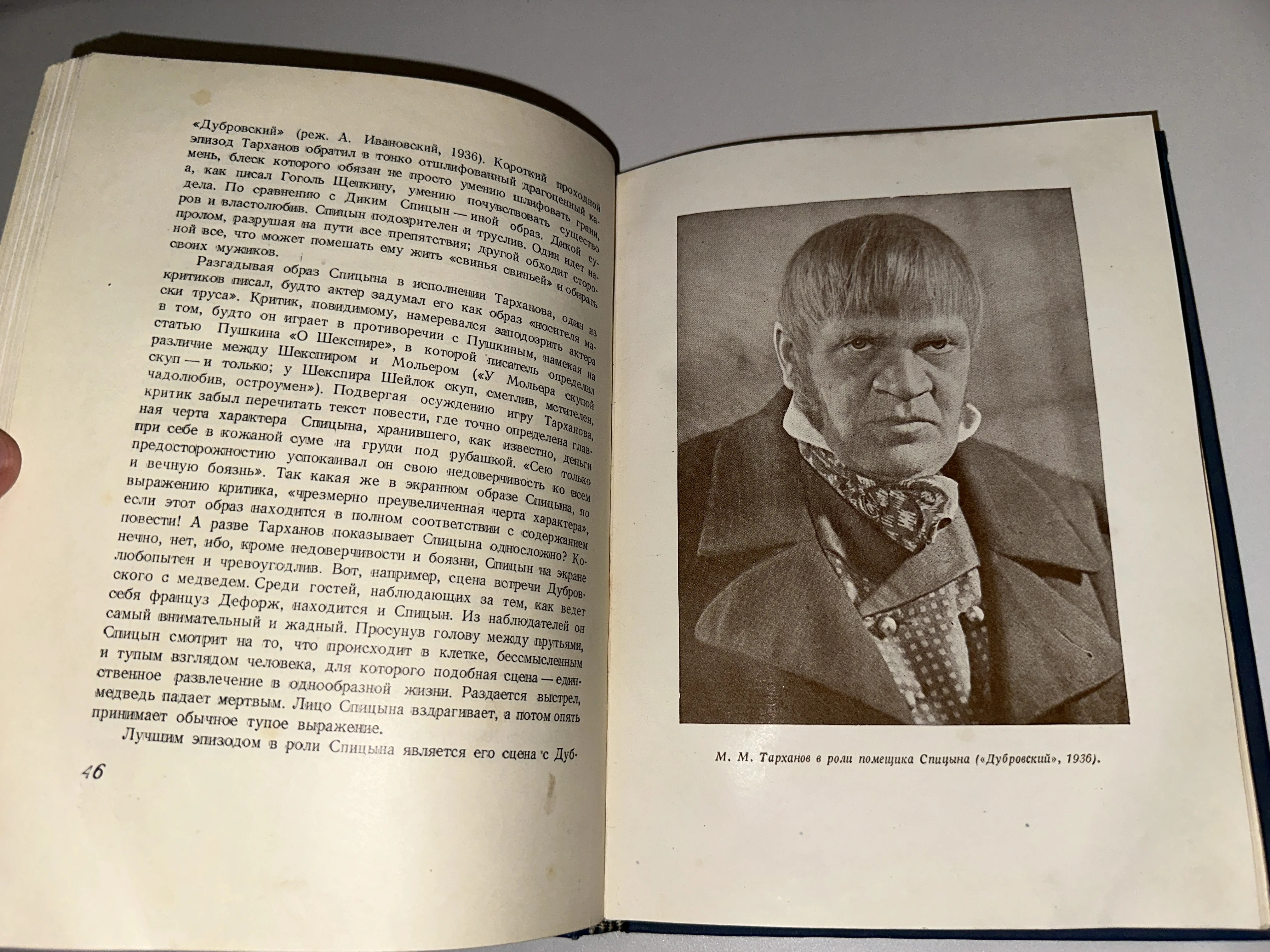 Антикварное издание, посвященное истории классического кинематографа и актерскому мастерству. На развороте представлен глубокий искусствоведческий анализ игры Михаила Тарханова и его портрет в характерном гриме, передающий атмосферу экранизации Пушкина. Страницы сохранили приятный оттенок времени, а типографская печать остается четкой и выразительной.