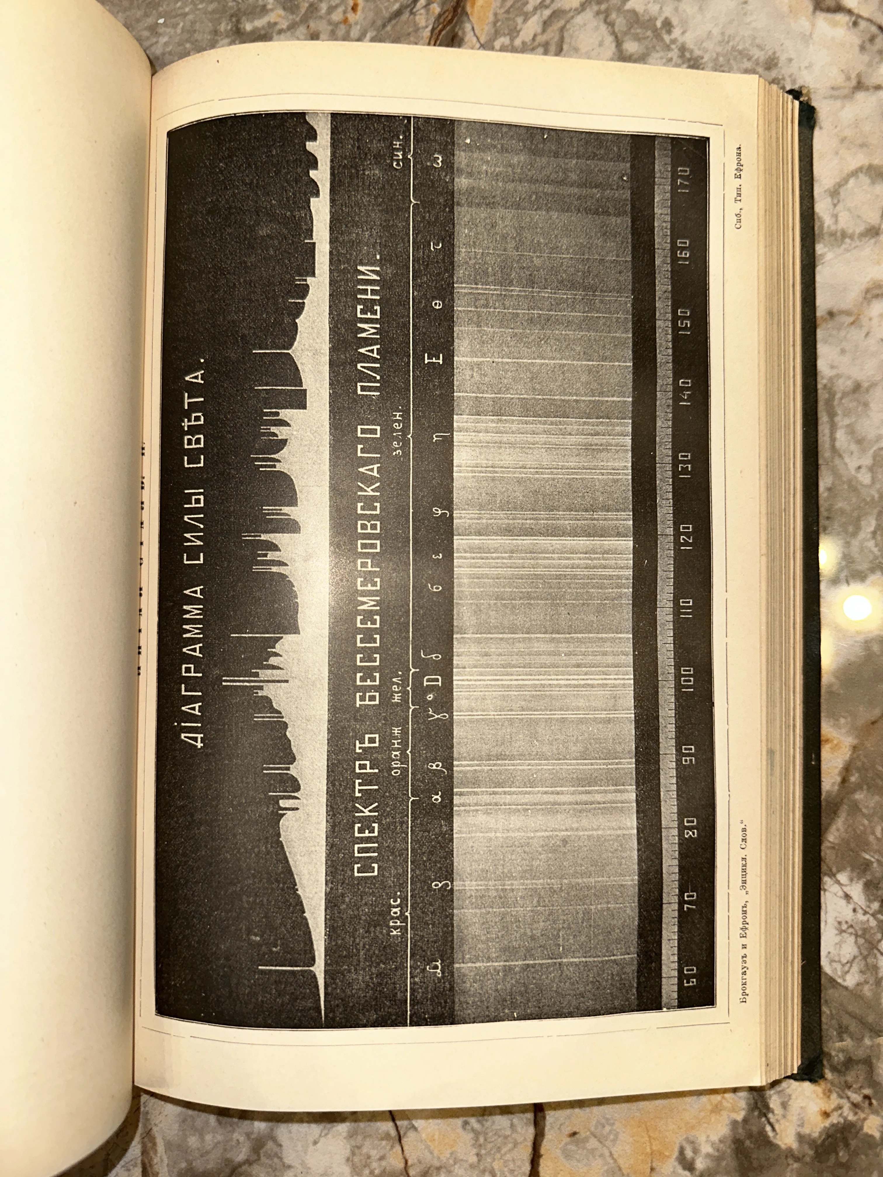 Перед вами подлинная страница из легендарного дореволюционного издания «Энциклопедический словарь Брокгауза и Ефрона». Иллюстрация демонстрирует сложный спектральный анализ пламени, выполненный с безупречной типографской точностью конца XIX века. Этот лист — не просто научный документ, а живое свидетельство эпохи индустриального прогресса, сохранившее благородную патину времени и уникальную дореформенную орфографию.
