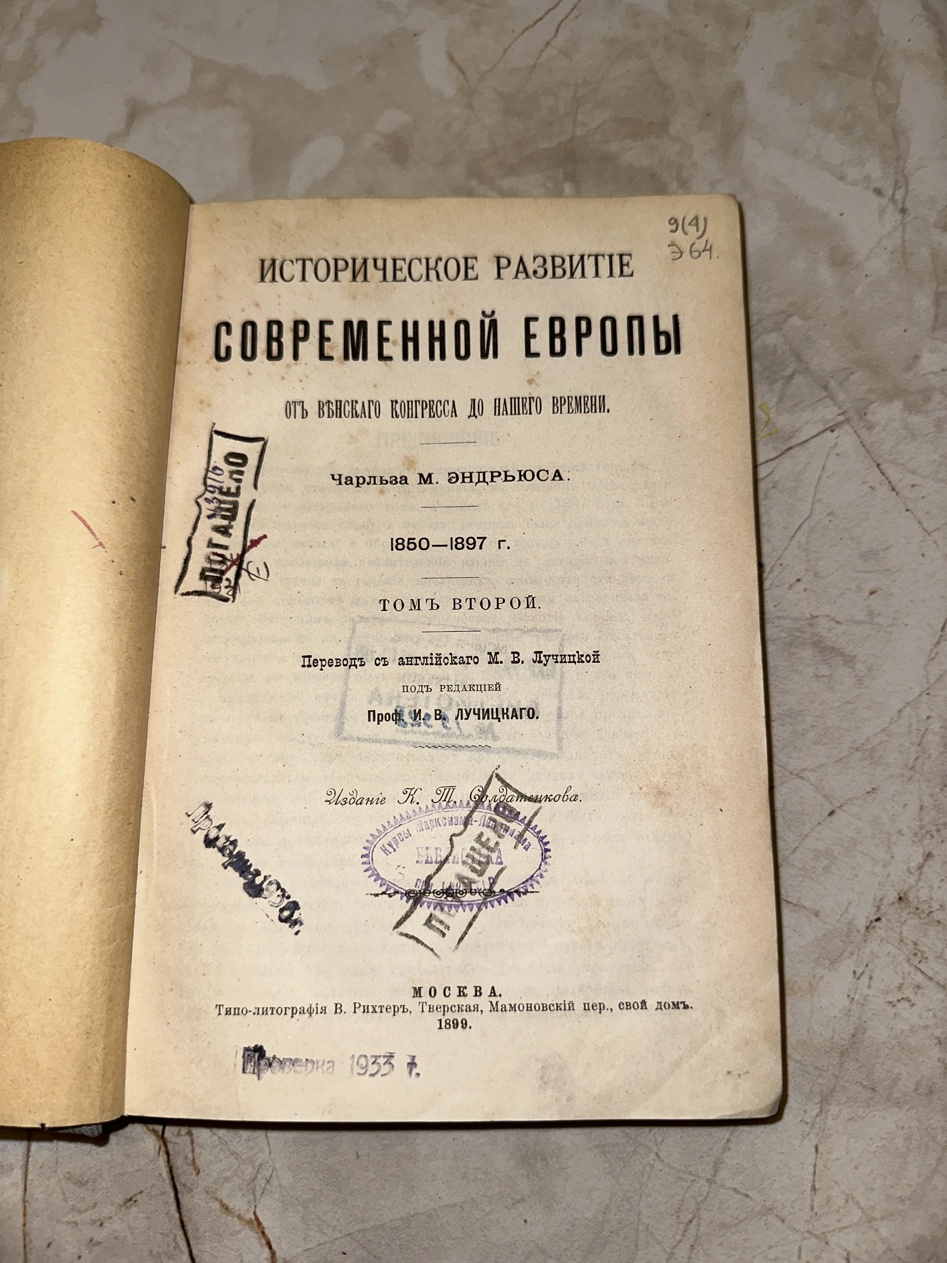 Титульный лист антикварной книги Чарльза Эндрюса об истории Европы с печатями библиотечного гашения и штампами 1930-х годов.