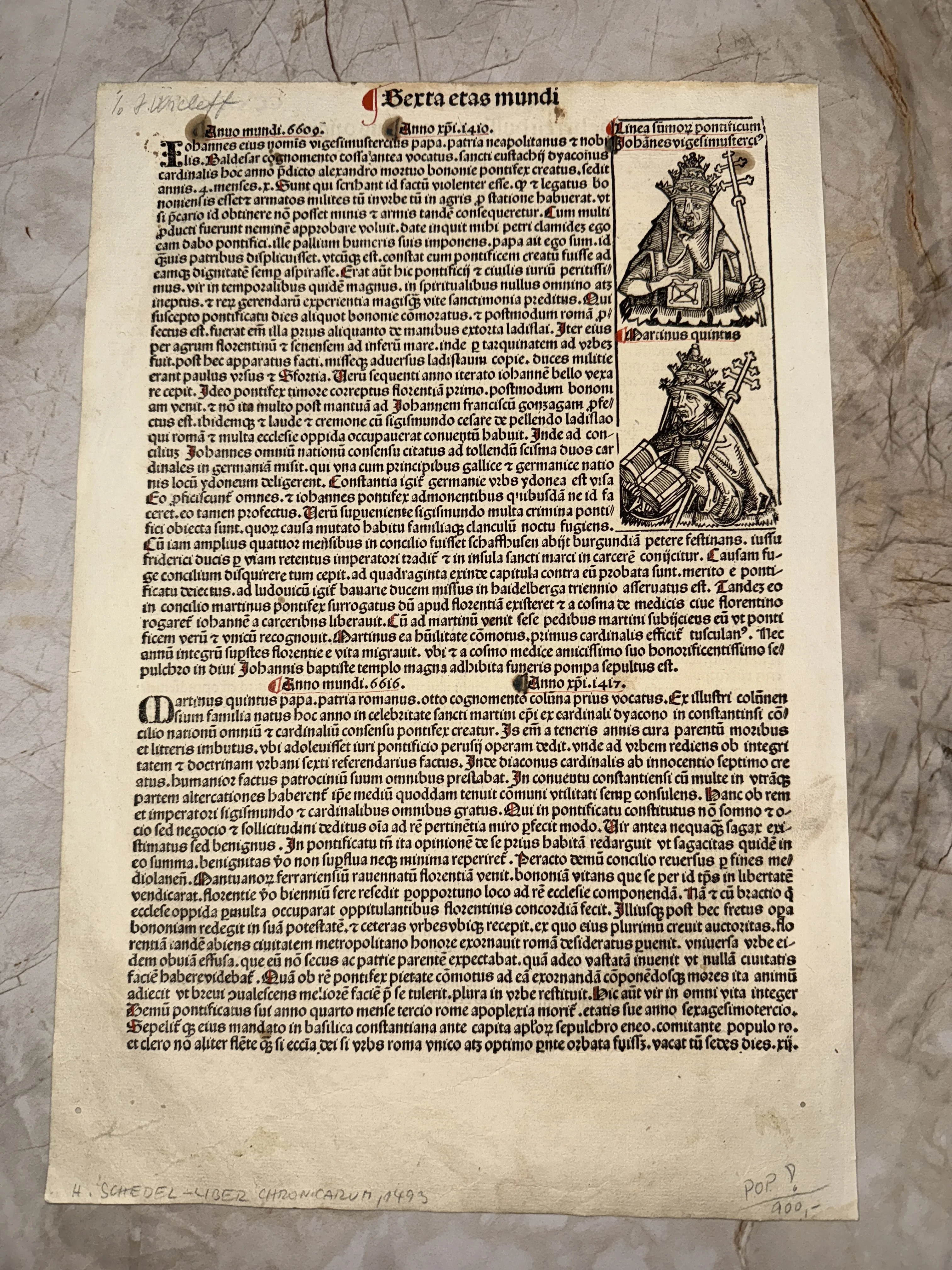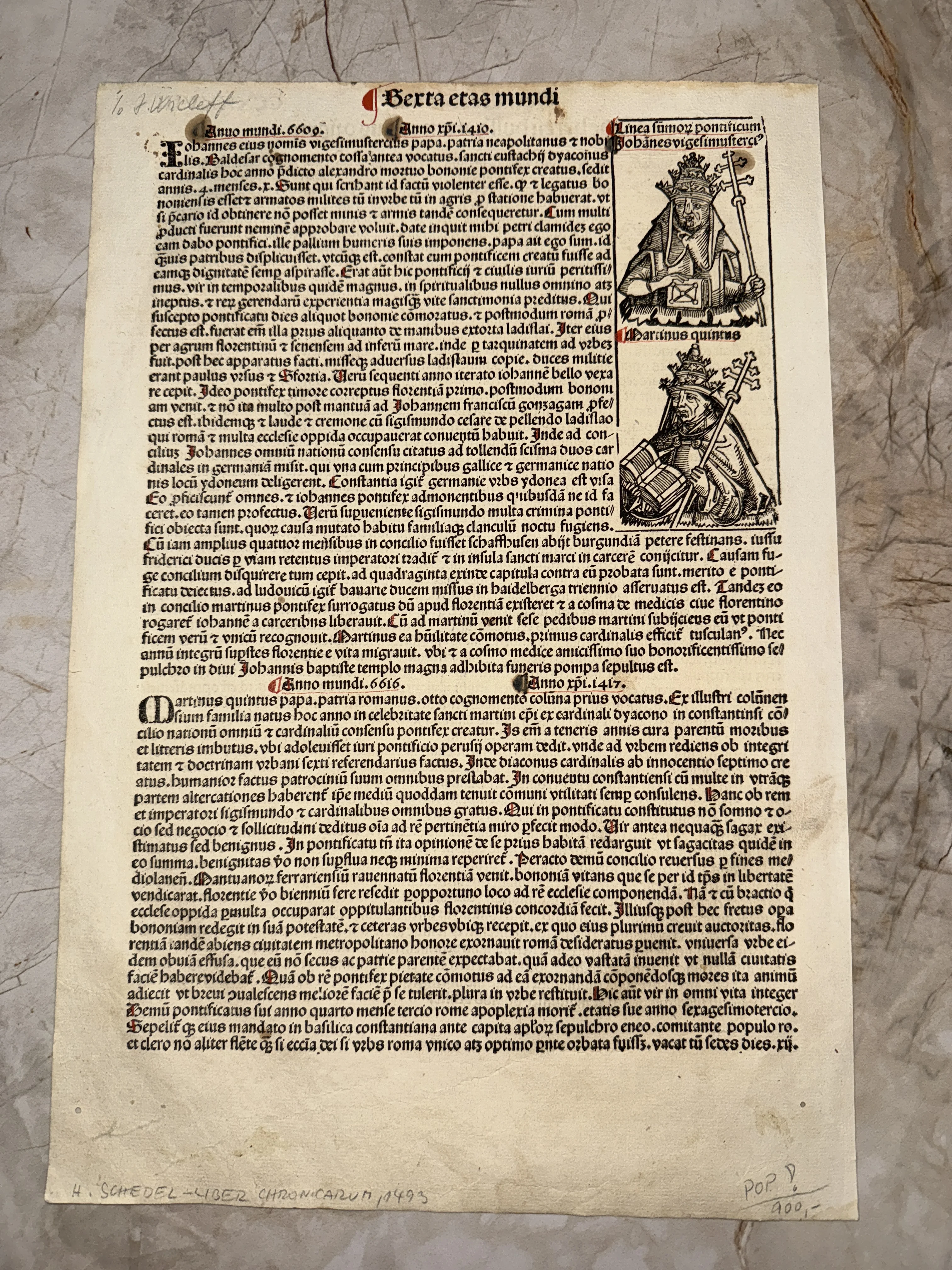 Уникальный фрагмент истории — подлинный лист из знаменитой «Нюрнбергской хроники», изданной в типографии Антона Кобергера. Страница содержит детальные ксилографии и классический готический шрифт на плотной верже с характерной патиной времени. Это великолепный образец инкунабулы, представляющий высокую коллекционную ценность для ценителей раннего книгопечатания.