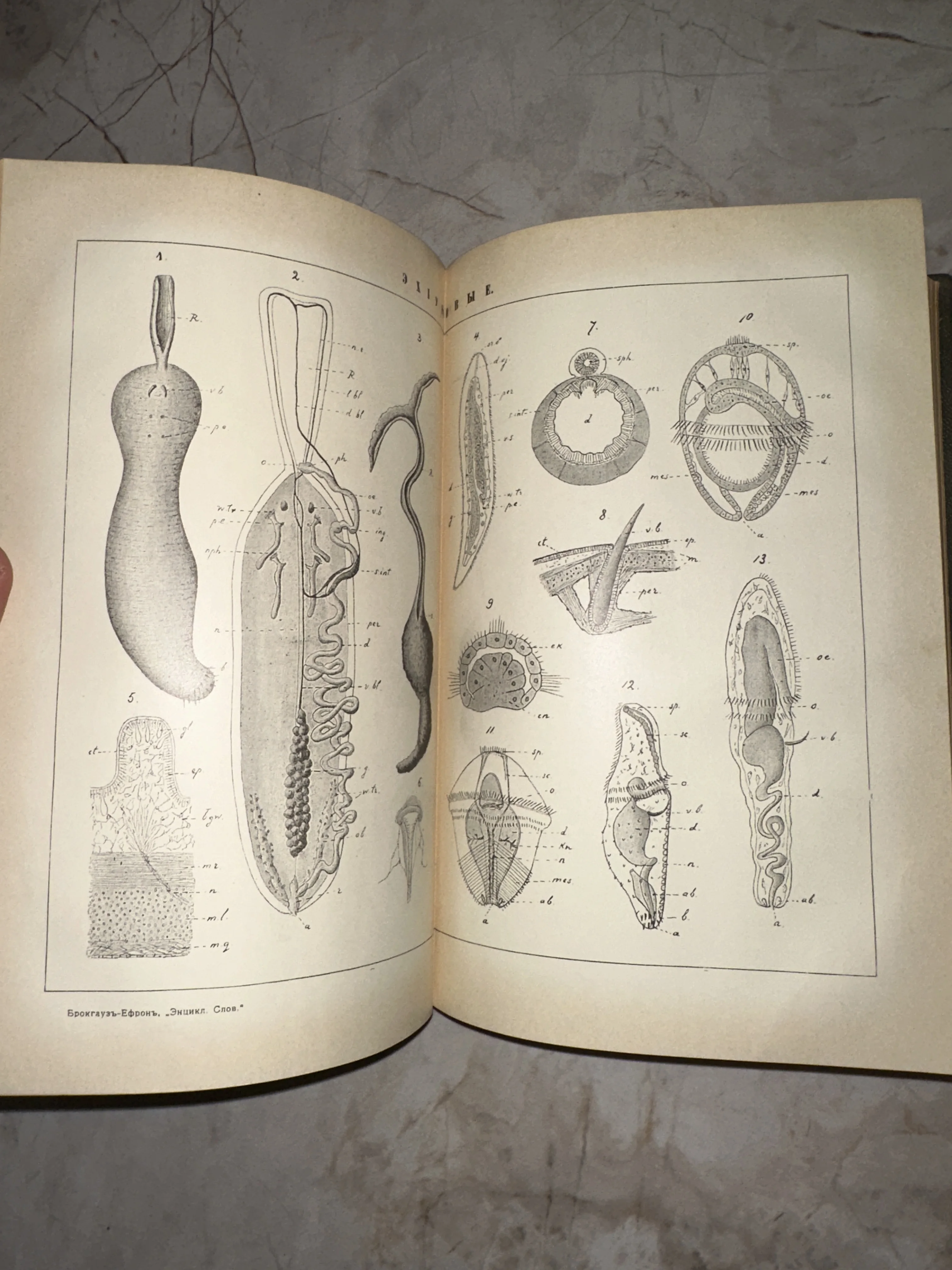 Разворот антикварного тома Брокгауза и Ефрона с биологическими гравюрами микроорганизмов и анатомических срезов.