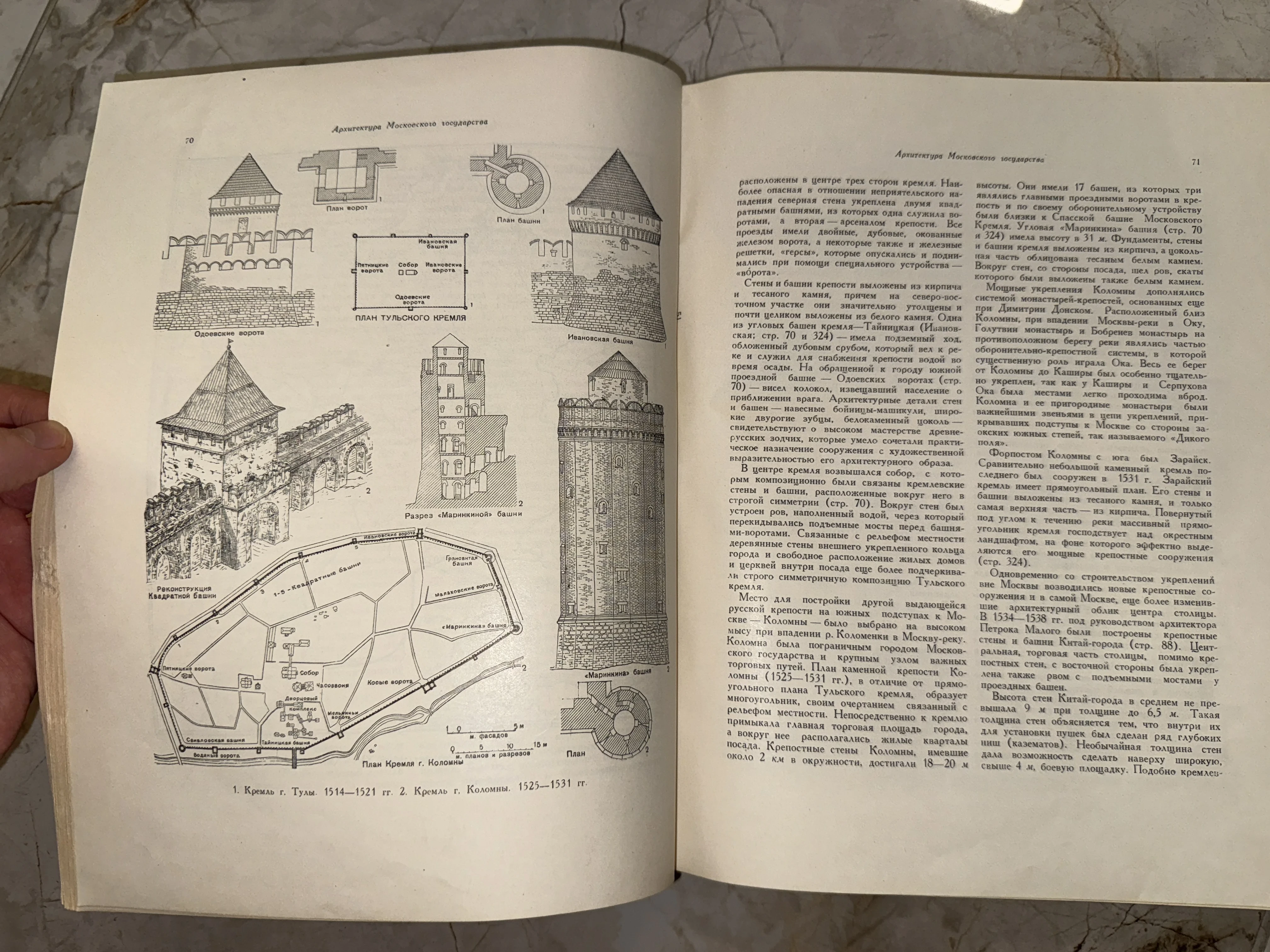 Детальный графический разворот из исторического издания, посвященный фортификационному искусству Московского государства. На страницах представлены филигранные чертежи Ивановской и Маринкиной башен, а также подробные планы кремлевских стен Тулы и Коломны. Прекрасный образец академической графики, передающий масштаб и мощь древнерусского оборонного зодчества.