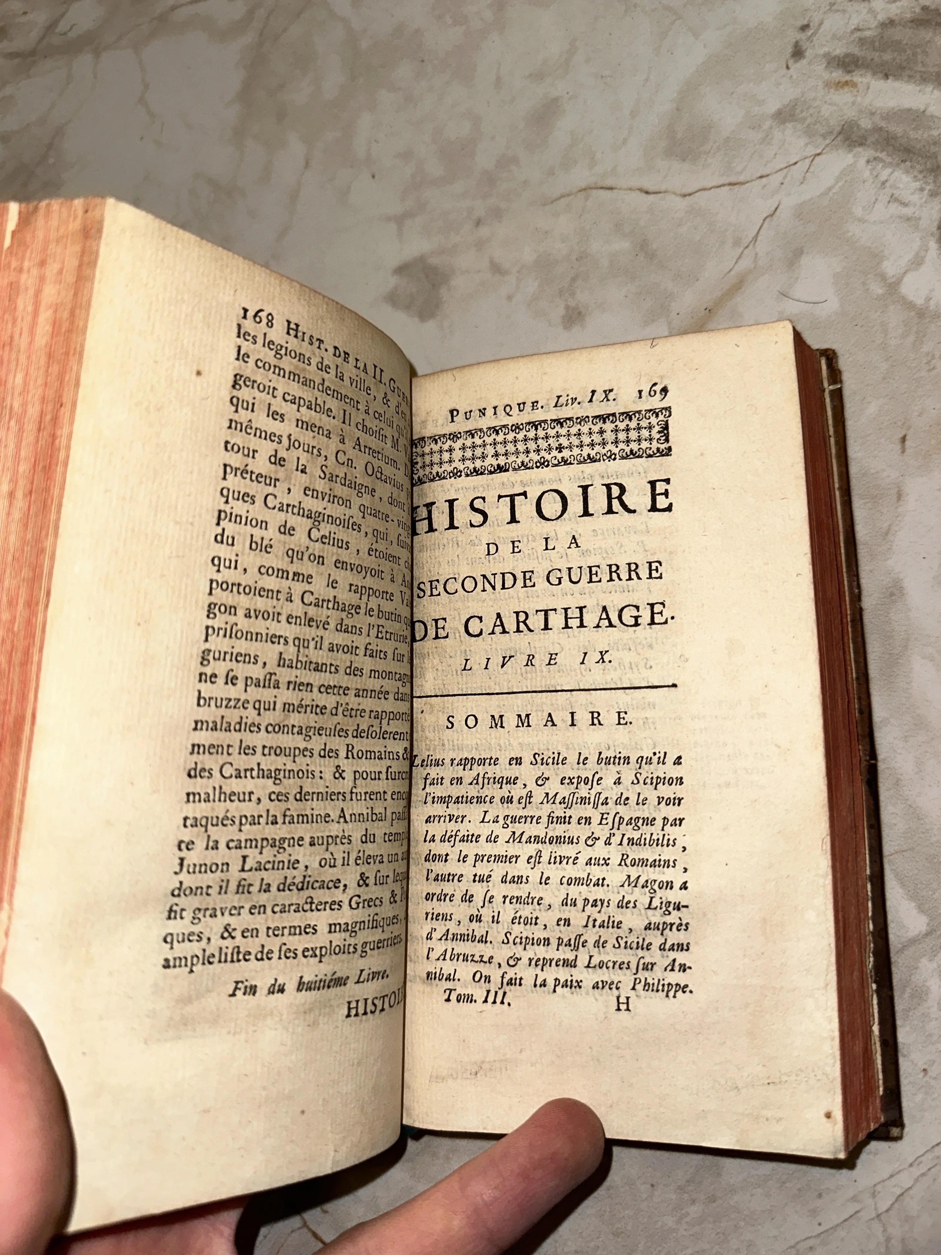 Изящный образец европейской полиграфии, посвященный легендарному противостоянию Рима и Карфагена. Издание сохранило четкость старинного шрифта и благородный красный обрез, а естественная патина времени на страницах придает книге особую историческую ценность. Идеальный предмет для коллекции по военной истории или классической литературе.