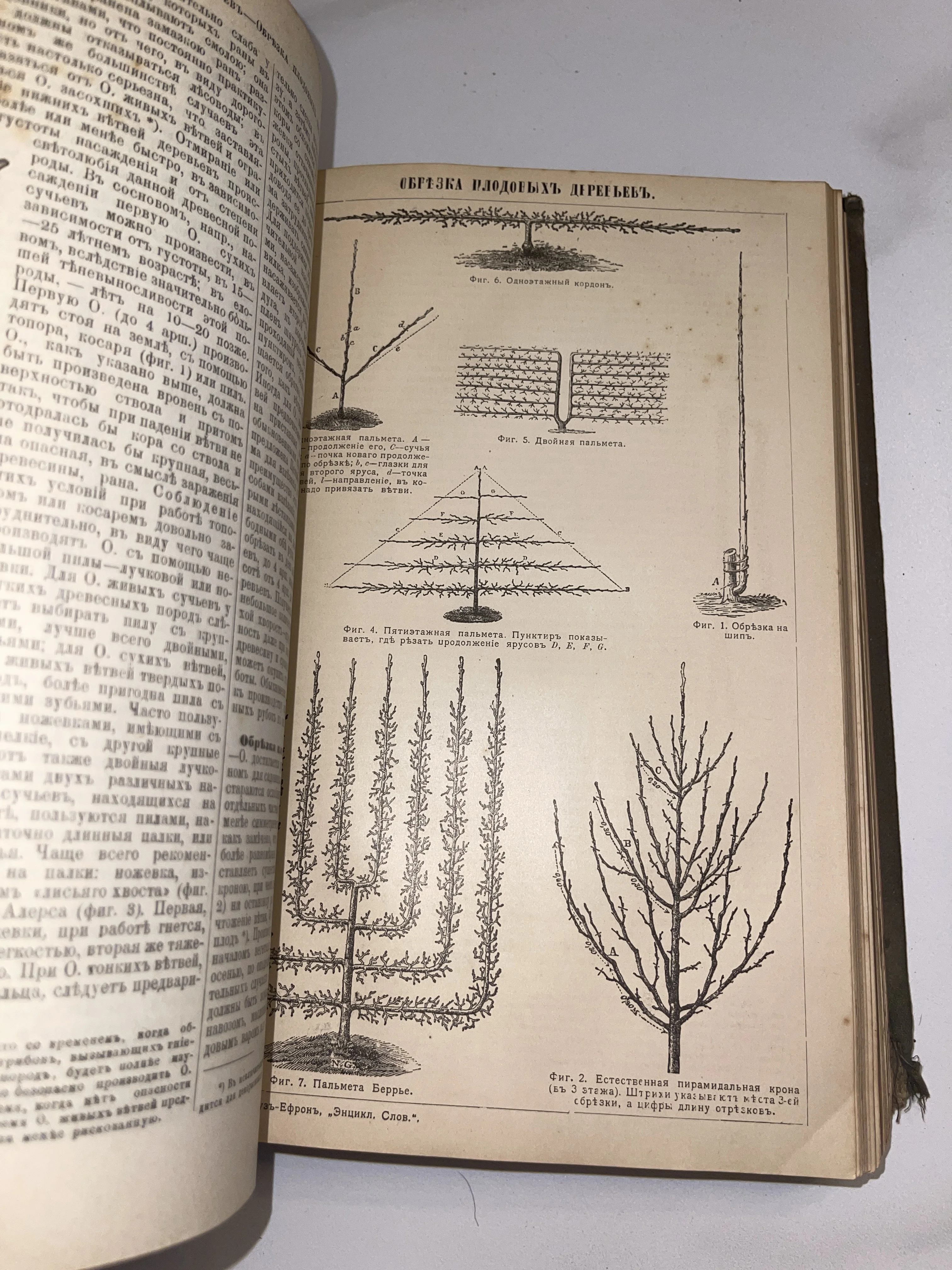 Перед вами уникальный разворот из дореволюционного издания, посвященный искусству садоводства и правильной обрезке деревьев. Детальные графические схемы пальметт и кордонов на пожелтевшей бумаге передают академическую точность агрономии начала XX века. Книга сохранила прекрасную четкость шрифта и иллюстраций, представляя не только практическую, но и высокую коллекционную ценность.