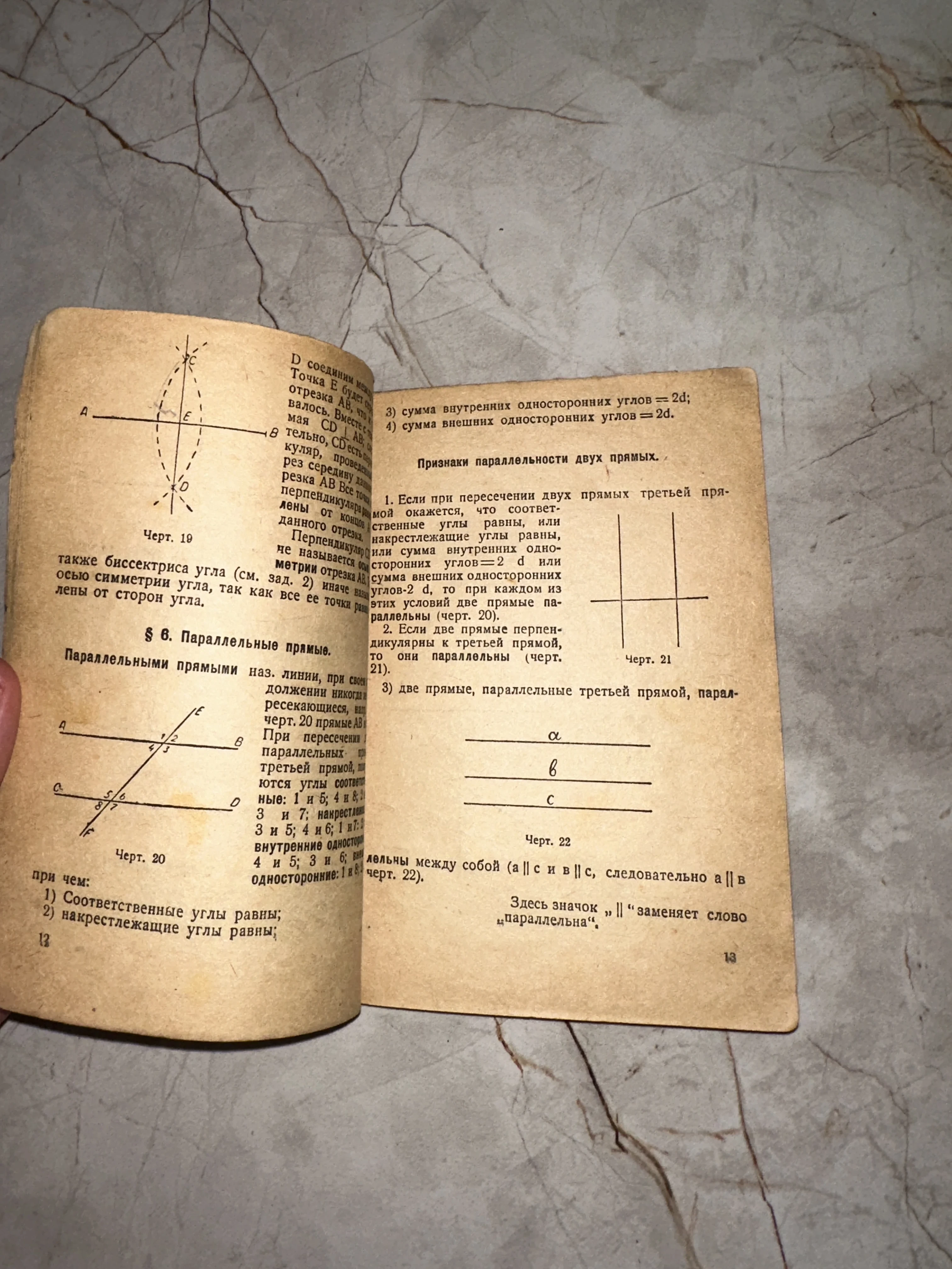 Раритетное издание, посвященное основам евклидовой геометрии, с характерными для своей эпохи четкими чертежами и строгой типографикой. Пожелтевшие от времени страницы сохранили дух классического образования, а компактный формат делает этот экземпляр прекрасным дополнением тематической коллекции. На развороте детально представлены признаки параллельности прямых, сопровождаемые пояснительными иллюстрациями.