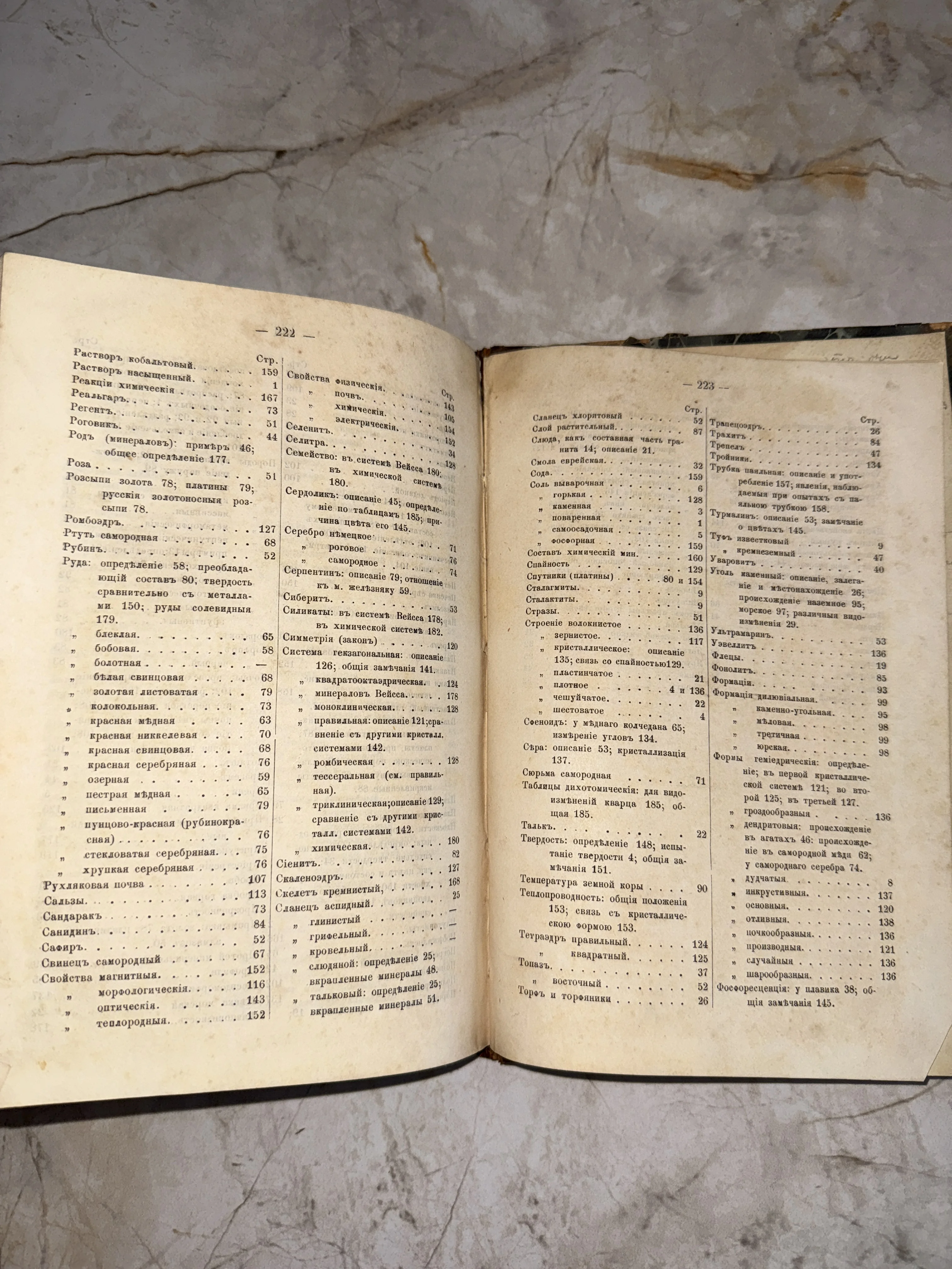 Разворот старинной книги на страницах 222-223 с алфавитным указателем минералов и химических терминов на дореволюционном русском языке.