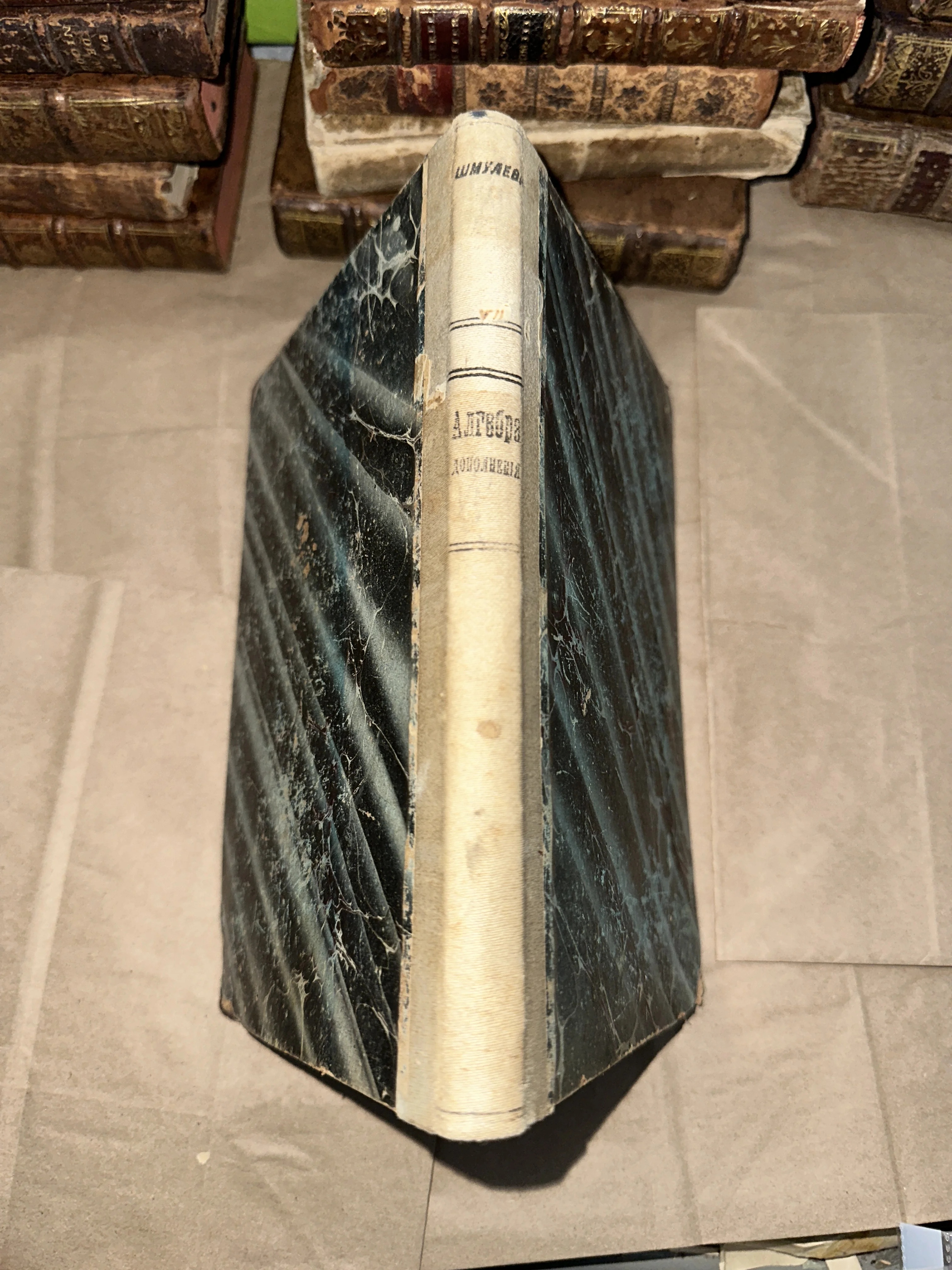 Перед вами редкий образец академической литературы прошлого века в оригинальном составном переплете с характерным мраморным рисунком. Благородная патина и потертости на корешке подчеркивают почтенный возраст издания, превращая учебный фолиант в эстетичный предмет коллекционирования. Книга сохранила дух эпохи и станет прекрасным дополнением для тематической библиотеки или декора в классическом стиле.