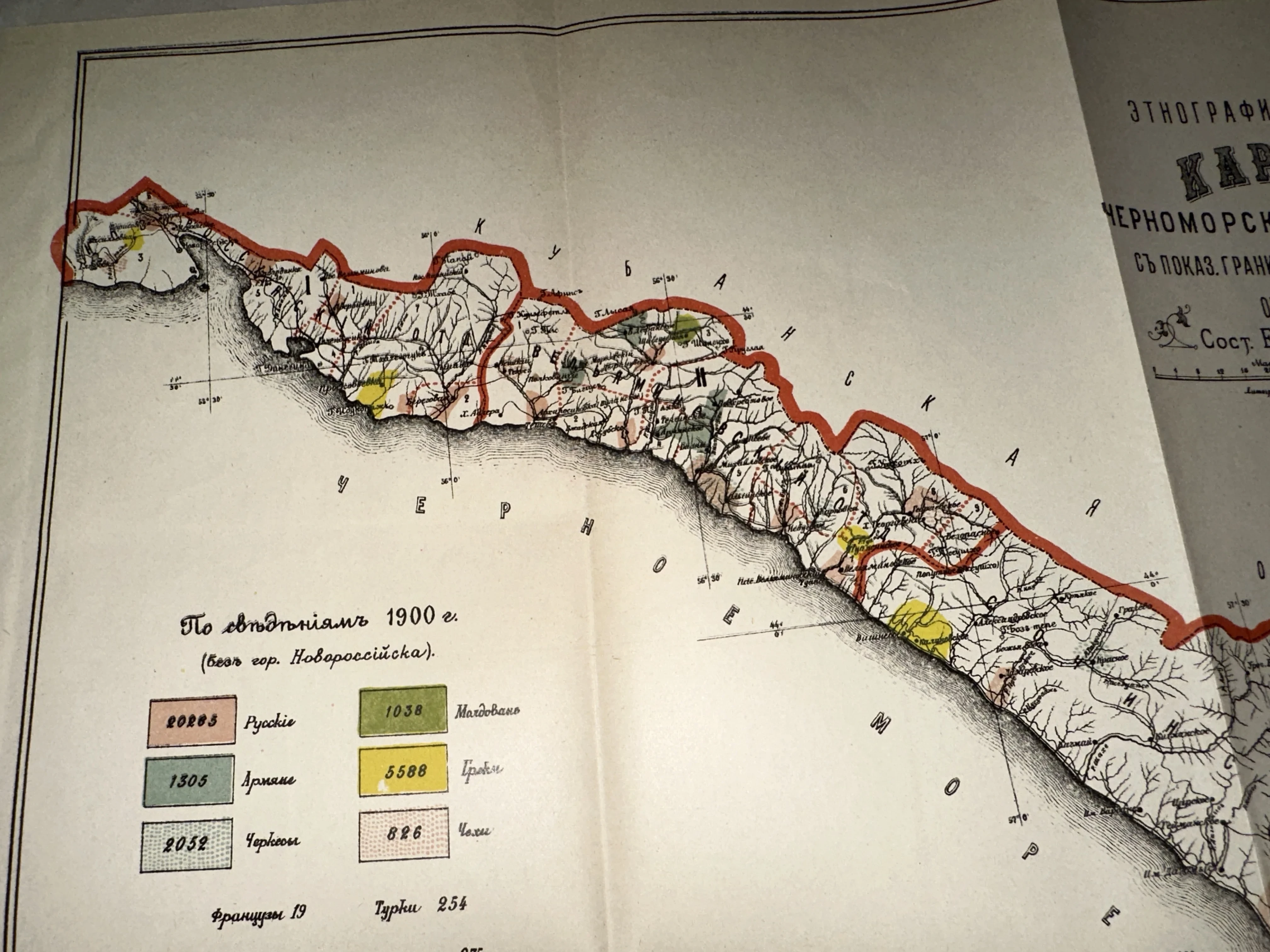 Уникальный картографический документ, наглядно демонстрирующий многонациональный колорит Черноморского побережья на рубеже XIX и XX веков. На карте детально зафиксированы поселения русских, греков, армян и черкесов с указанием численности населения, что делает её ценным источником для историков и краеведов. Превосходная сохранность бумаги и четкость типографской печати позволяют оценить тонкую графику и аутентичную палитру того времени.
