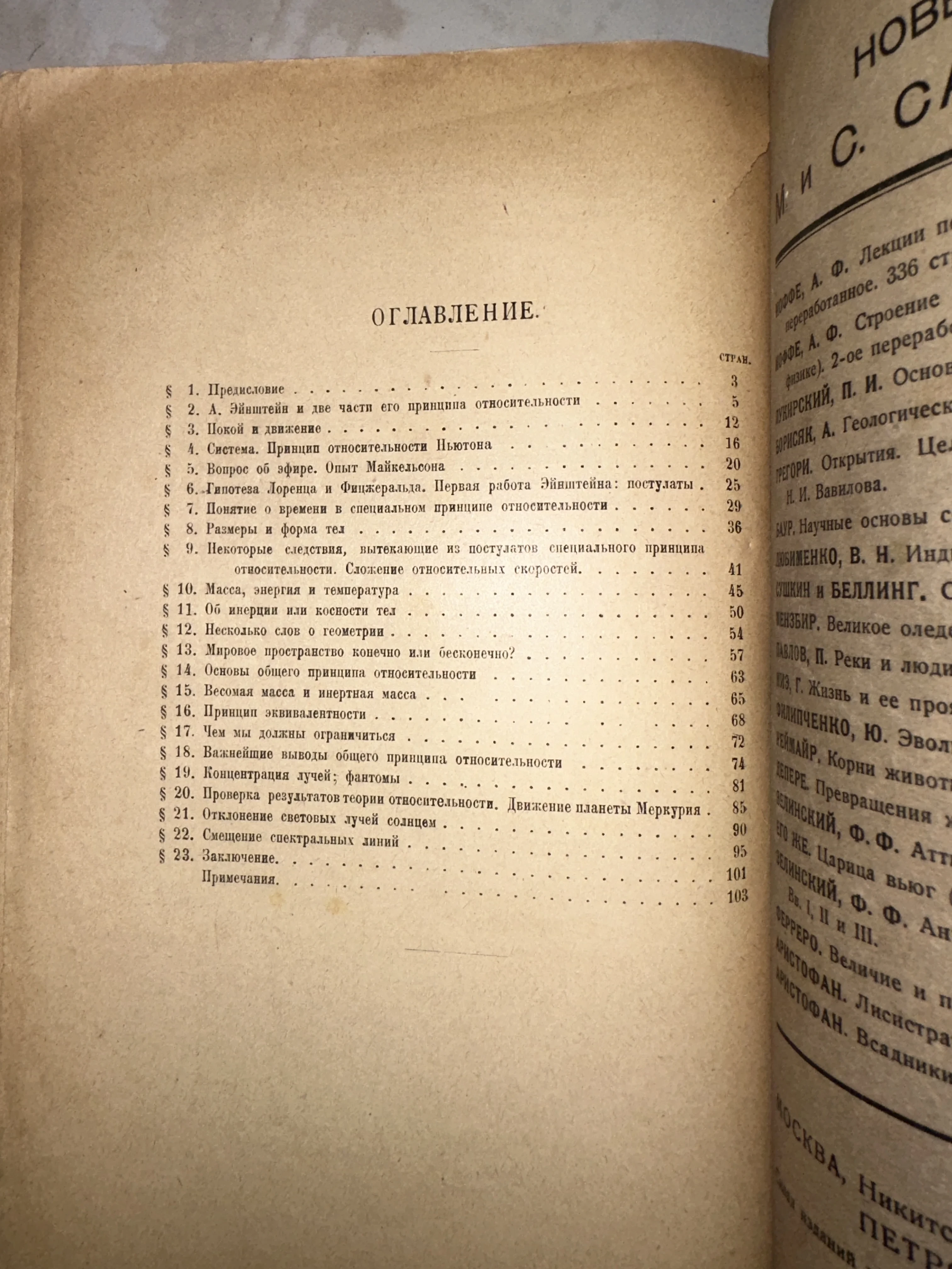 Оглавление антикварного издания по теории относительности