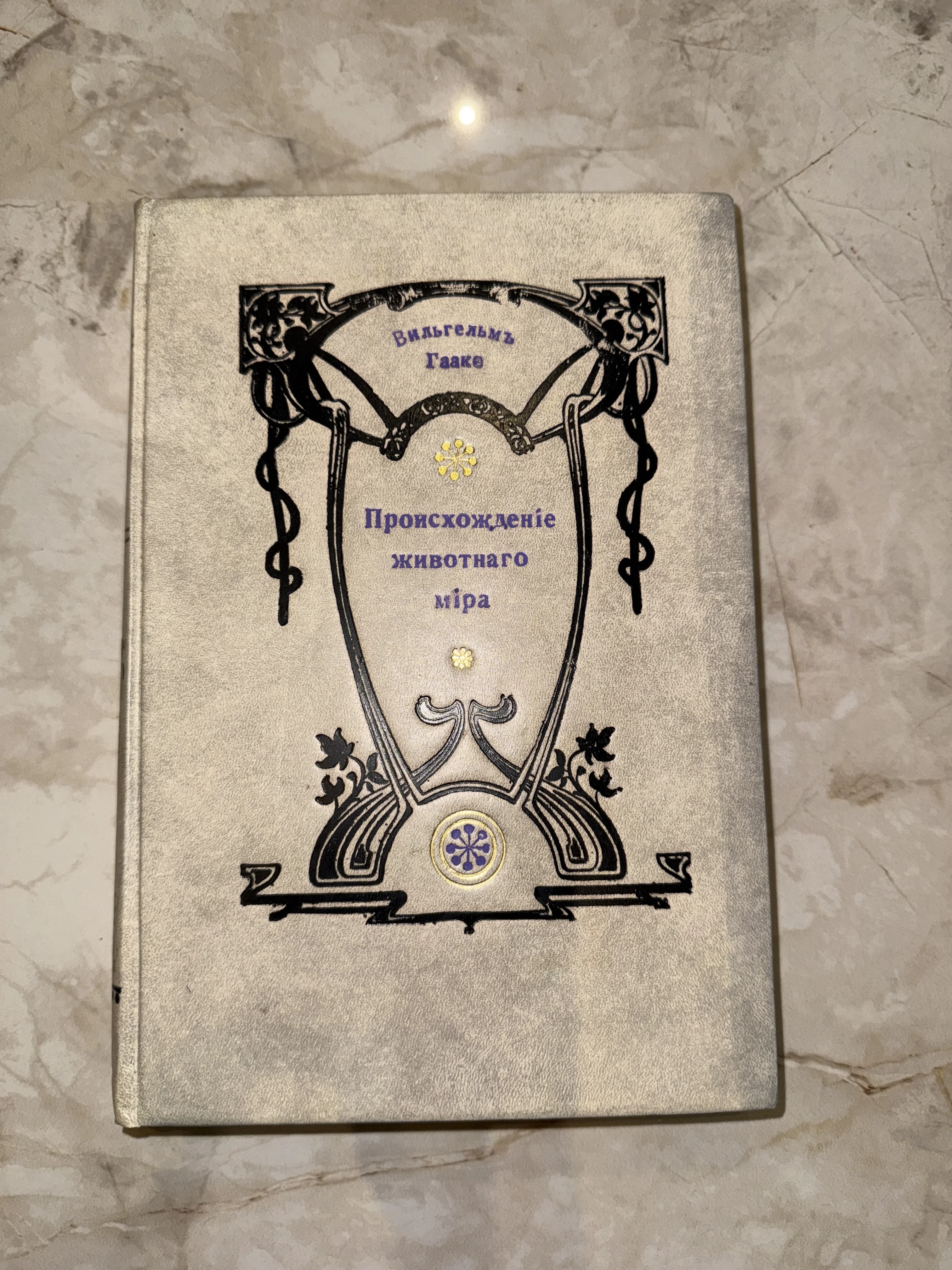 Старинная книга Вильгельма Гааке «Происхождение животного мира» в светлом переплете с изящным черным орнаментом в стиле модерн.