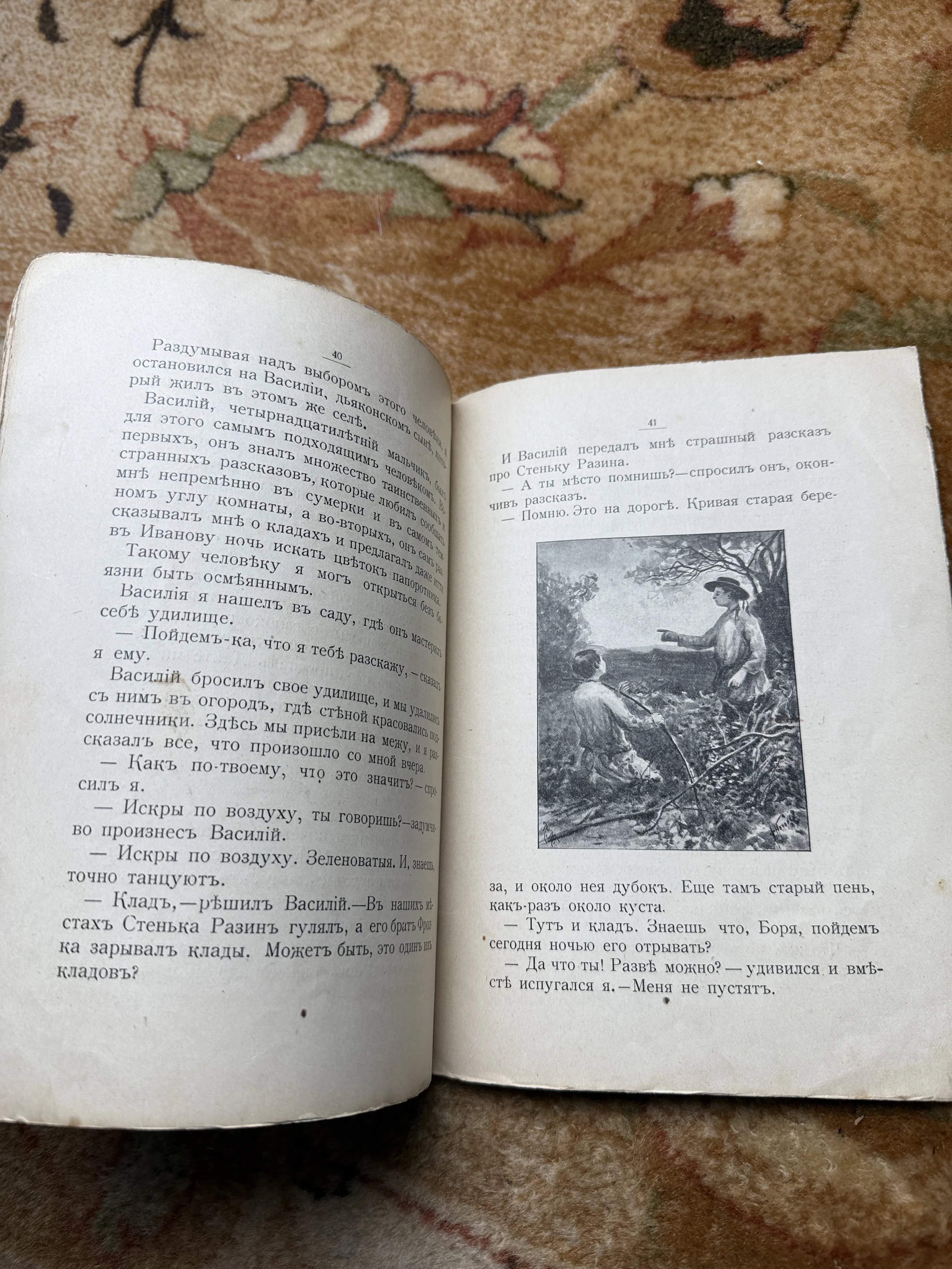 Уникальный образец дореволюционной полиграфии с сохранившейся орфографией начала XX века. Страницы повествуют о таинственных кладах Степана Разина, дополняя рассказ детальной графической иллюстрацией, передающей дух приключений. Книга сохранила естественную патину времени и станет жемчужиной в коллекции любителя русской классической букинистики.