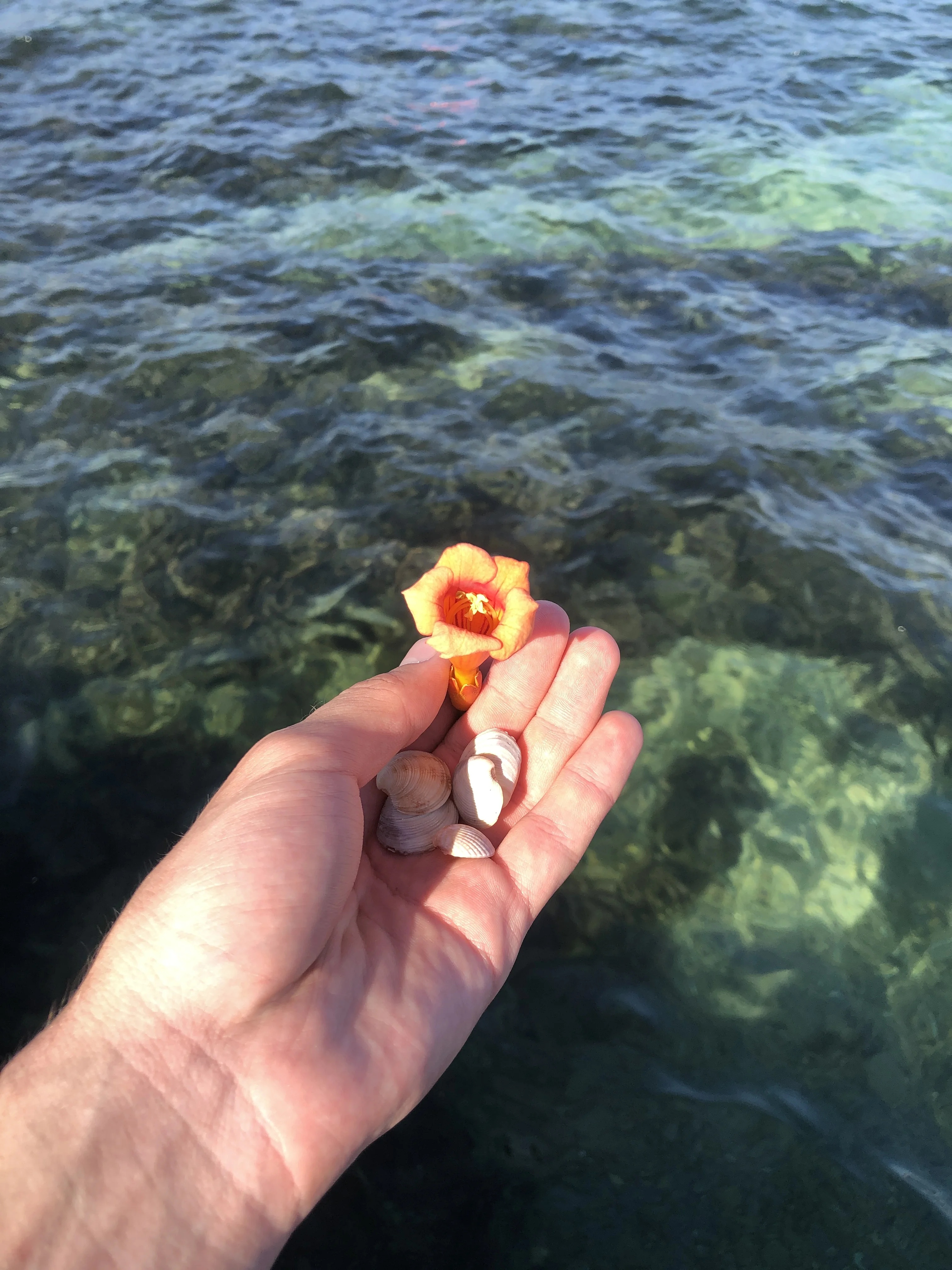 Раскрытая ладонь с морскими ракушками и ярким оранжевым цветком на фоне прозрачной бирюзовой воды.
