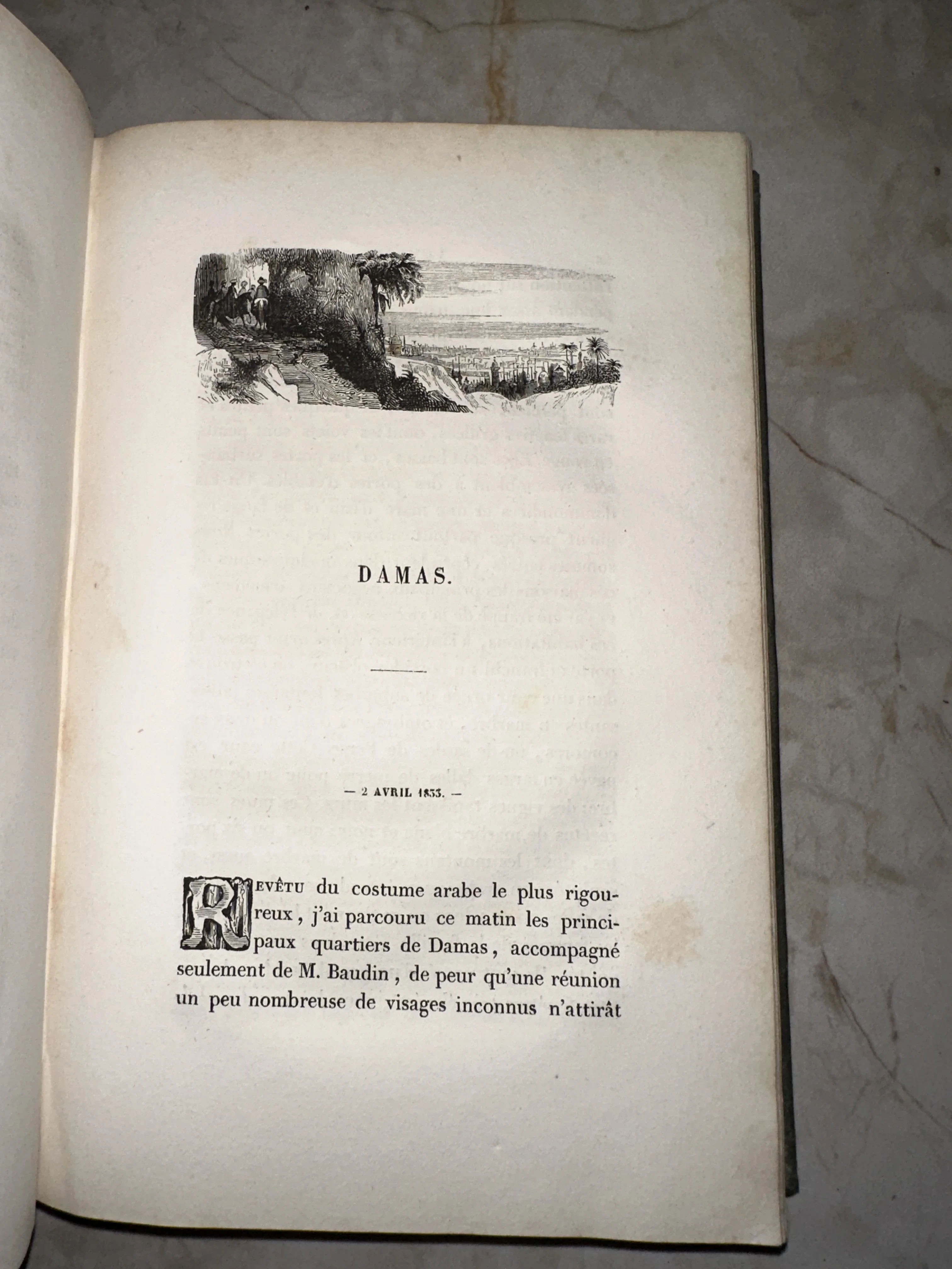 Изящная страница из французского издания середины XIX века, открывающая главу о Дамаске. Детализированная гравюра передает дух восточных странствий, а сохранившаяся декоративная буквица и благородная патина времени на бумаге подчеркивают коллекционную ценность этого экземпляра.
